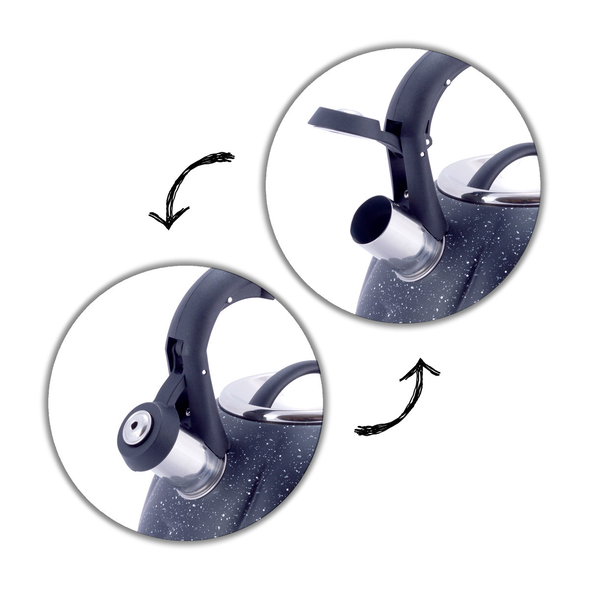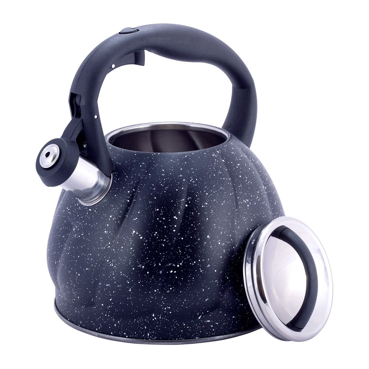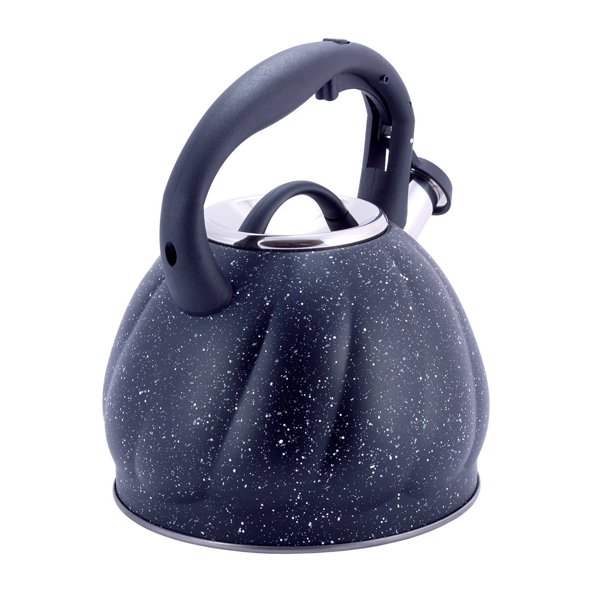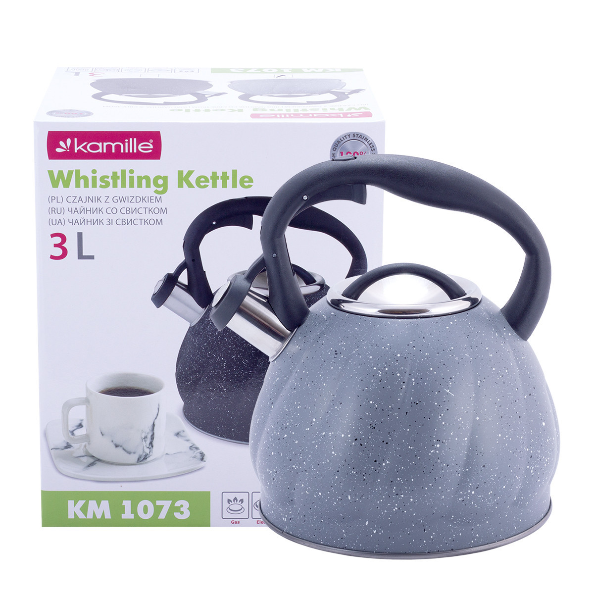 Чайник kamille серый 3л из нержавеющей стали со свистком и нейлоновой ручк. Бренд: Kamille Описание: Процесс чаепития давно прочно вошел в жизнь каждого человека во всем мире. И для того, чтобы приготовить ароматный чай, необходимо первым делом вскипятить воду. По сути, подогреть воду можно в любой кухонной посудине, но от вкуса воды зависит и вкус напитка, поэтому лучше использовать специально выделенную для этих целей посуду, а именно — чайники Kamille. Чайники Kamille изготовлены из высококачественных материалов с использованием новейших технологий производства, благодаря чему они подходят для интенсивного ежедневного использования, а их эстетичный внешний вид непременно подойдет к дизайну Вашей кухни. Материал: нержавеющая сталь. Общий объем: 3л. Цвет чайника: Серый мрамор, серый мрамор. Цвет ручки: черная. Материал крышки: нержавеющая сталь. Материал ручки: нейлон. Диаметр дна (снаружи): 19см. Высота (с ручкой): 24,5см. Тип ручки: фиксированная. Свисток: есть. Подходит для индукционных плит: да. Подходит для мытья в посудомоечной машине: нет. Упаковка: цветная картонная коробка 20,5*20,5*25см. Особенности: стильный современный дизайн высокая надежность и устойчивость к царапинам утолщенное индукционное дно удобный и прочный механизм открывания свистка Использование: на индукционной плите на стекло-керамической плите на электрической плите на газовой плите