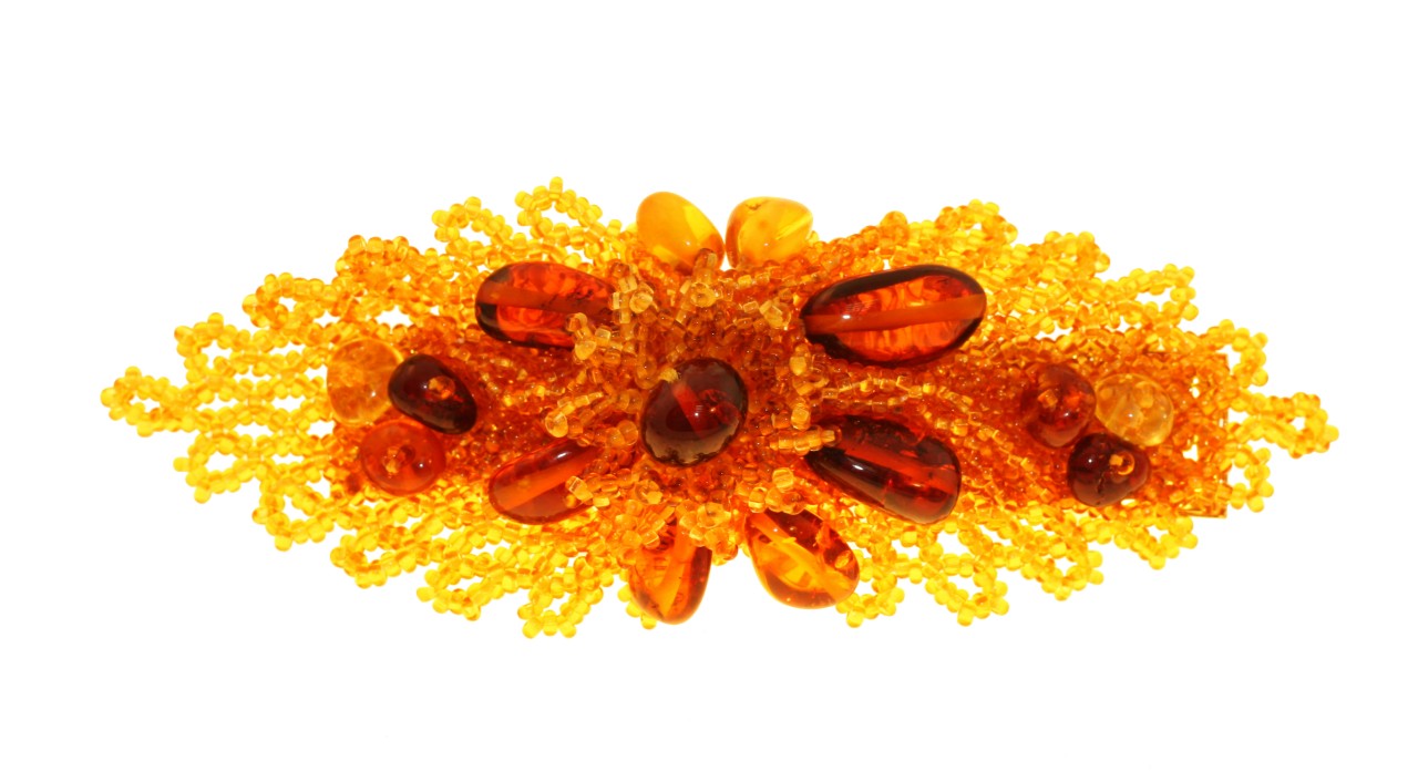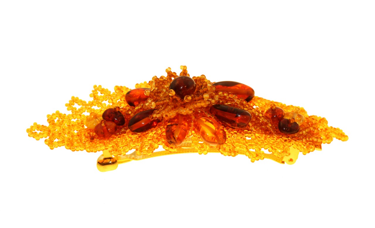 Заколка-автомат. Состав: янтарь, бисер, позолоченная латунь. В случае отсутствия товара на складе срок изготовления от 3-х недель.  развернуть описание ▼