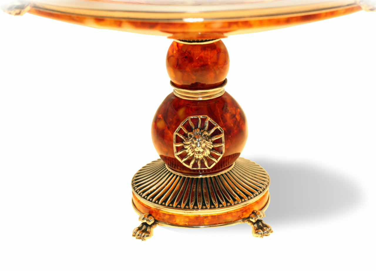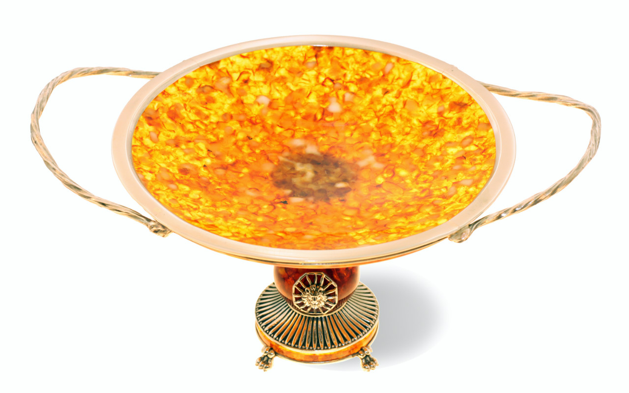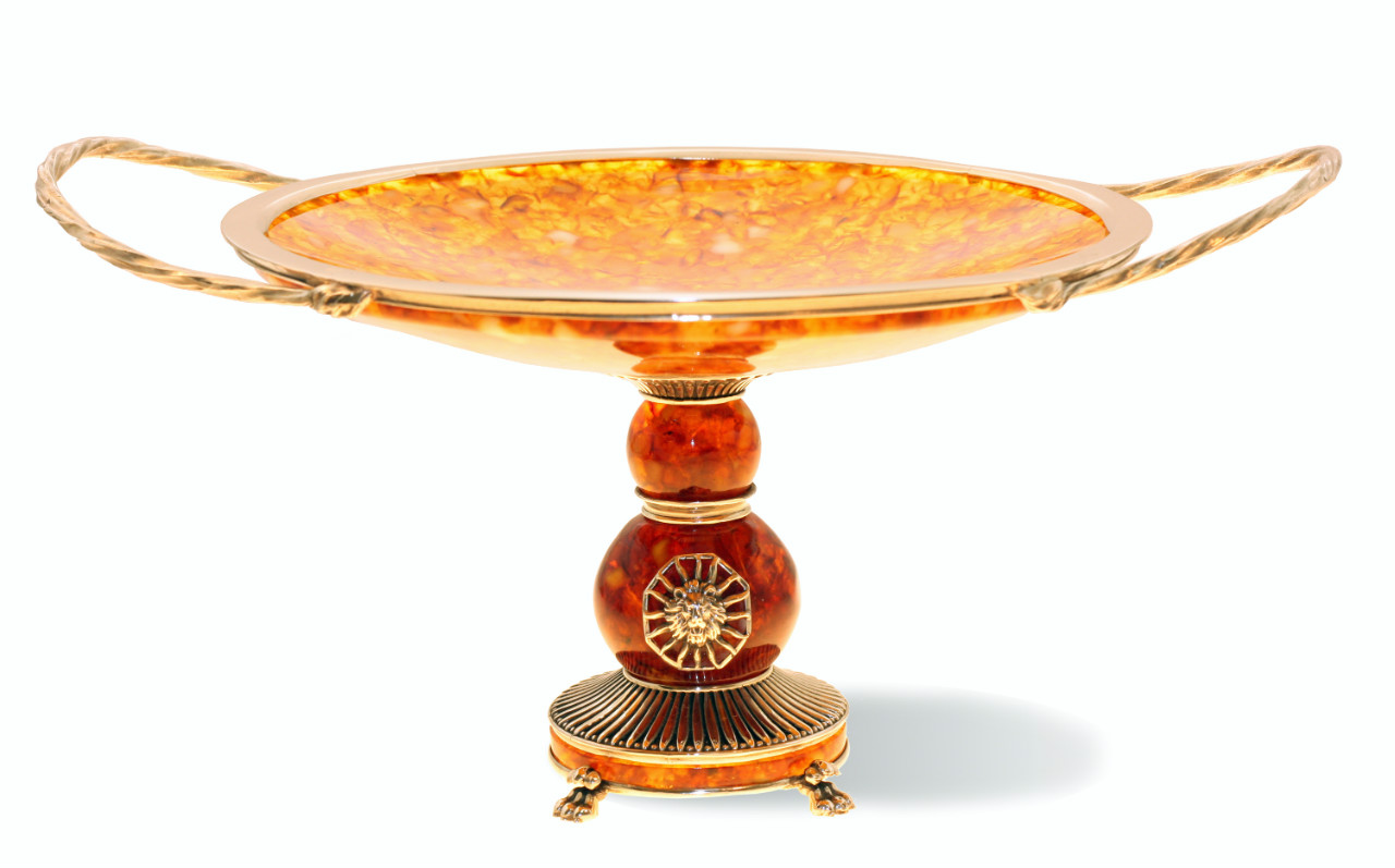 Конфетница "цезарь" из янтаря. Высота: 12,5 см, диаметр блюда: 16,5 см (с ручками 22,5 см) Состав: натуральный янтарь,белая ювелирная бронза или серебро 875 пробы. Вес серебра в изделии - 200 гр. Поставляется в подарочном футляре. В случае отсутствия товара на складе срок изготовления от трех недель.