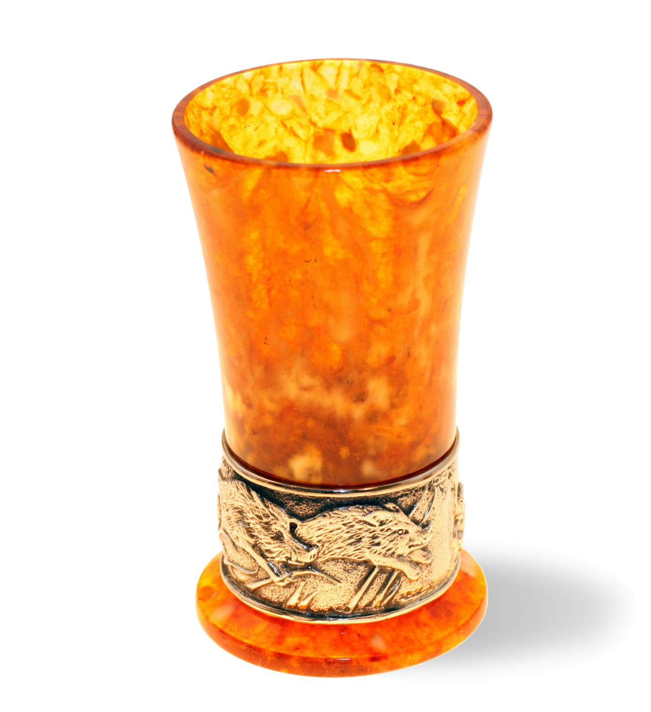 Стопка "охота" из янтаря. Высота: 8,0-8,5 см, диаметр: 5,0 см Объем: 50 мл. Состав: натуральный янтарь,белая ювелирная бронза или серебро 875 пробы. Вес серебра в изделии - 34 гр. Поставляется в подарочном футляре. В случае отсутствия товара на складе срок изготовления от трех недель.  развернуть описание ▼