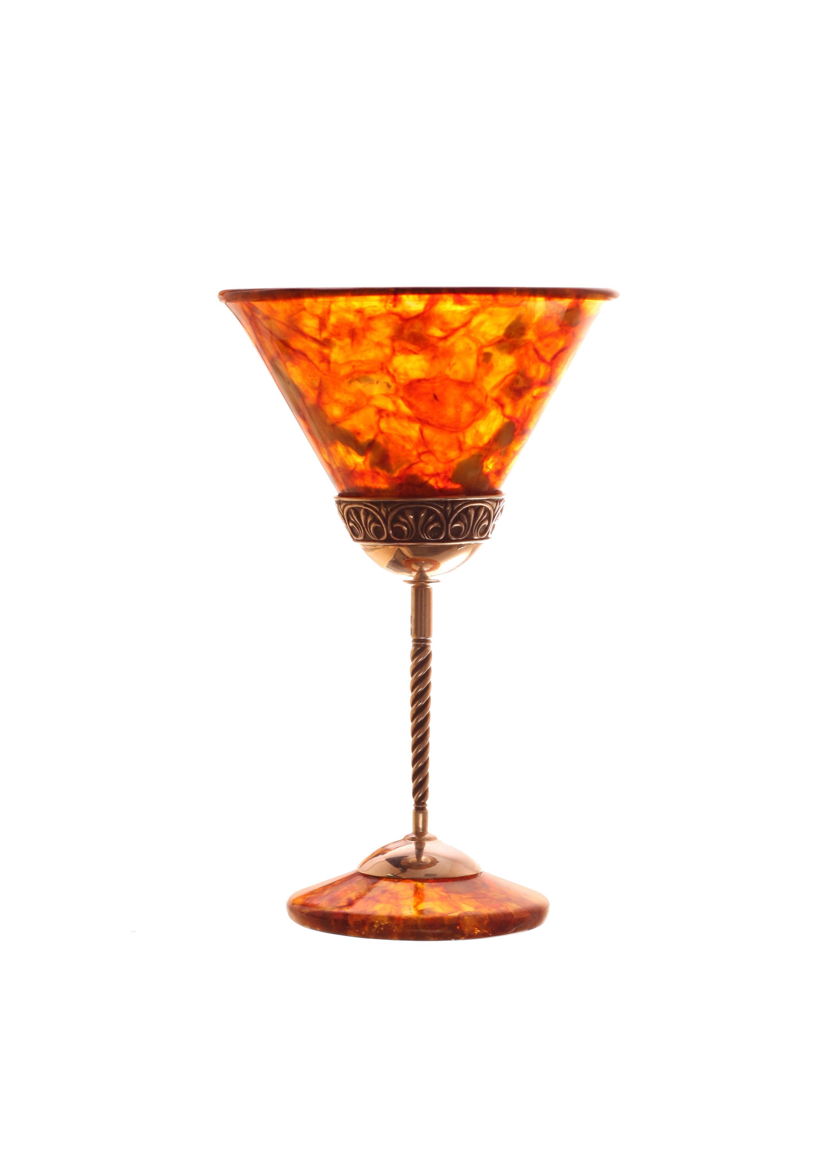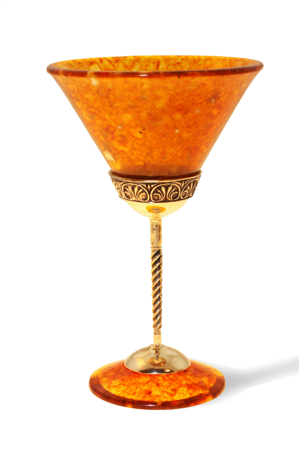 Бокал для мартини "антик" из янтаря. Высота: 7,0 см, диаметр емкости: 9,0 см Состав: натуральный янтарь, белая ювелирная бронза или серебро 875 пробы. Вес серебра в изделии - 42,5 гр. Поставляется в подарочном футляре. В случае отсутствия товара на складе срок изготовления от трех недель.
