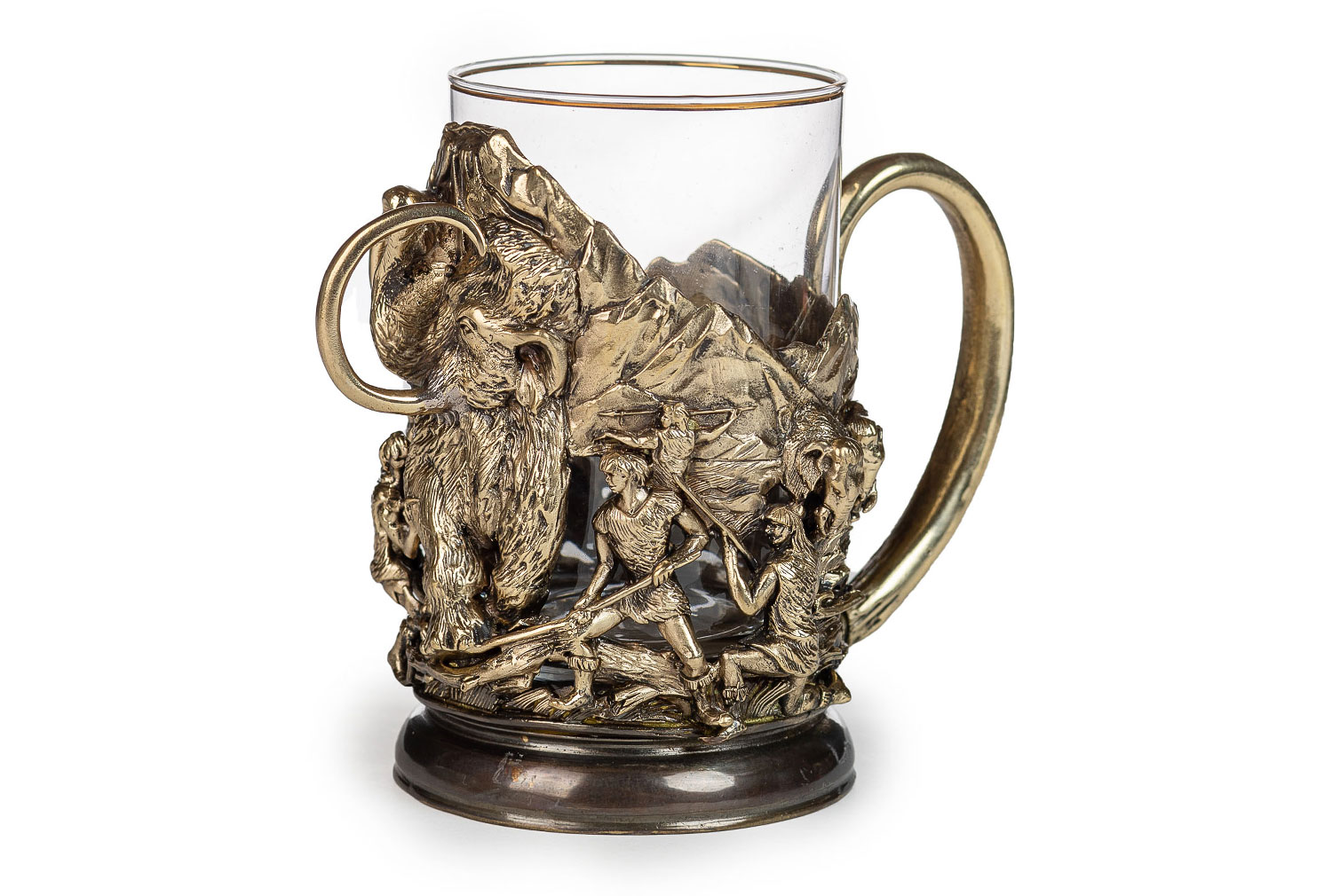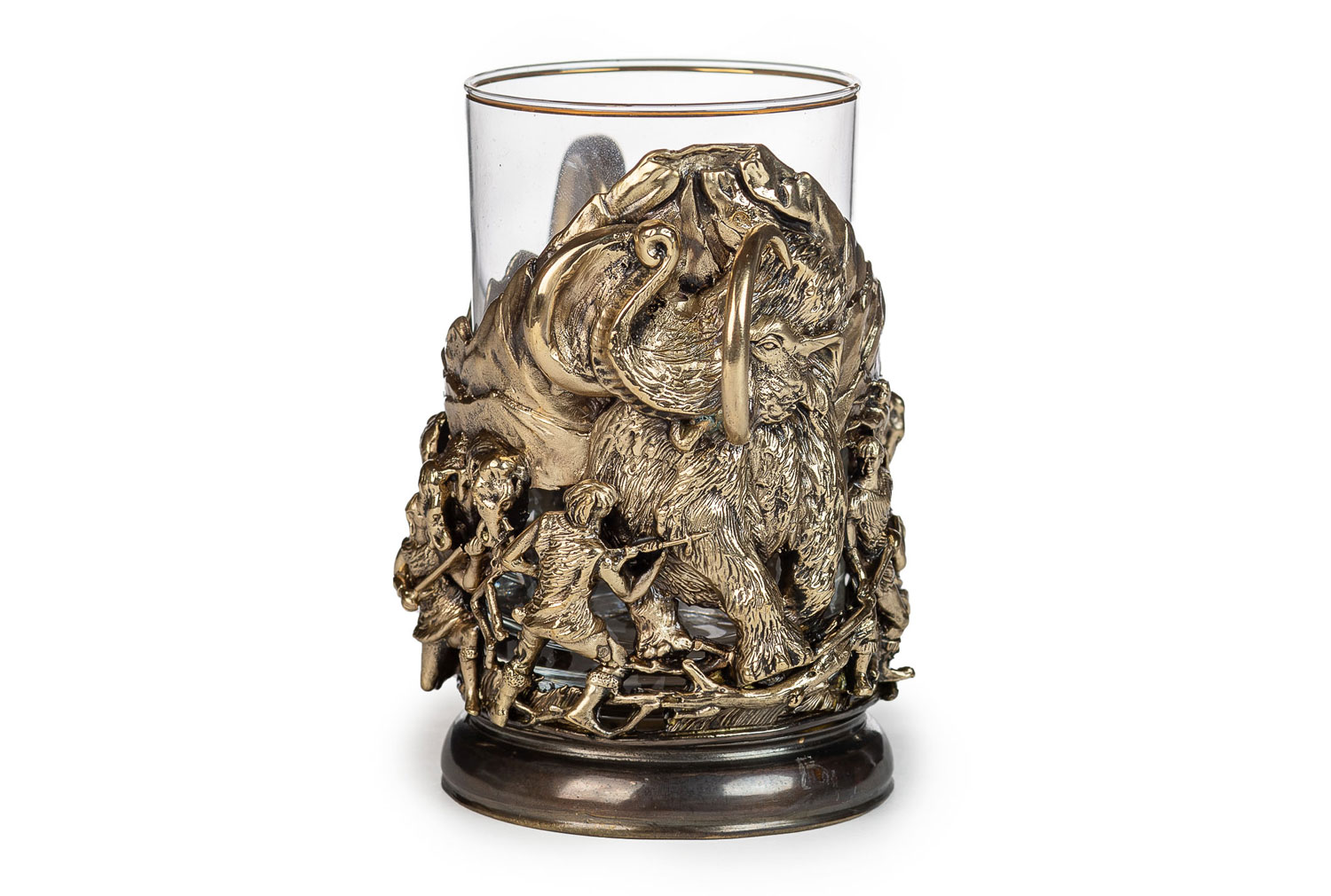 Подстаканник мамонт. Описание: Невероятно красив и необычен этот подстаканник ручной работы. Мы уверены, что такого вы еще не видели. Две полированные ручки в форме бивней мамонта позволяютнадежно удерживать в руках подстаканник с горячим чаем. Охота на мамонта изображена так живо и интересно, что хочется не только чай попить, но и рассматривать этот подстаканник долго-долго, как настоящее произведение искусства, находя все новых и новых персонажей, которых здесь так много. Прекрасный подраок для знатока и ценителя красивых и оригинальных вещей. Метод изготовления:  художественное литье из латуни (ручная работа) Стакан: Стекло, Производитель: Неман, Страна: Беларусь, Объем: 250 мл  Комплектация:  Подстаканник латунь Так же Вы можете приобрести для подстаканника подарочную упаковку и ложечку