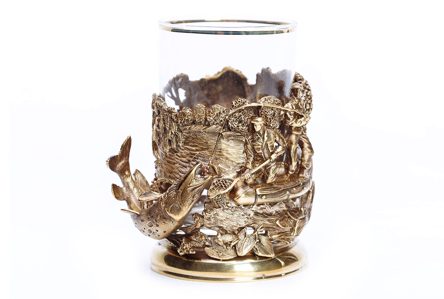 Подстаканник щука. Описание: Вот это щука! Так и кажется, что сейчас она взмолится отпустить ее в воду, а она за это исполнит желания. Но все это настолько красиво, что мы ее конечно же не отпустим, а будем попивать чай и любоваться на эту красотку. Хороший подарок приятелю-рыбаку. Метод изготовления: художественное литье из латуни (ручная работа) Стакан: Стекло, Производитель: Неман, Страна: Беларусь, Объем: 250 мл Комплектация: Подстаканник латунь Так же Вы можете приобрести для подстаканника подарочную упаковку и ложечку