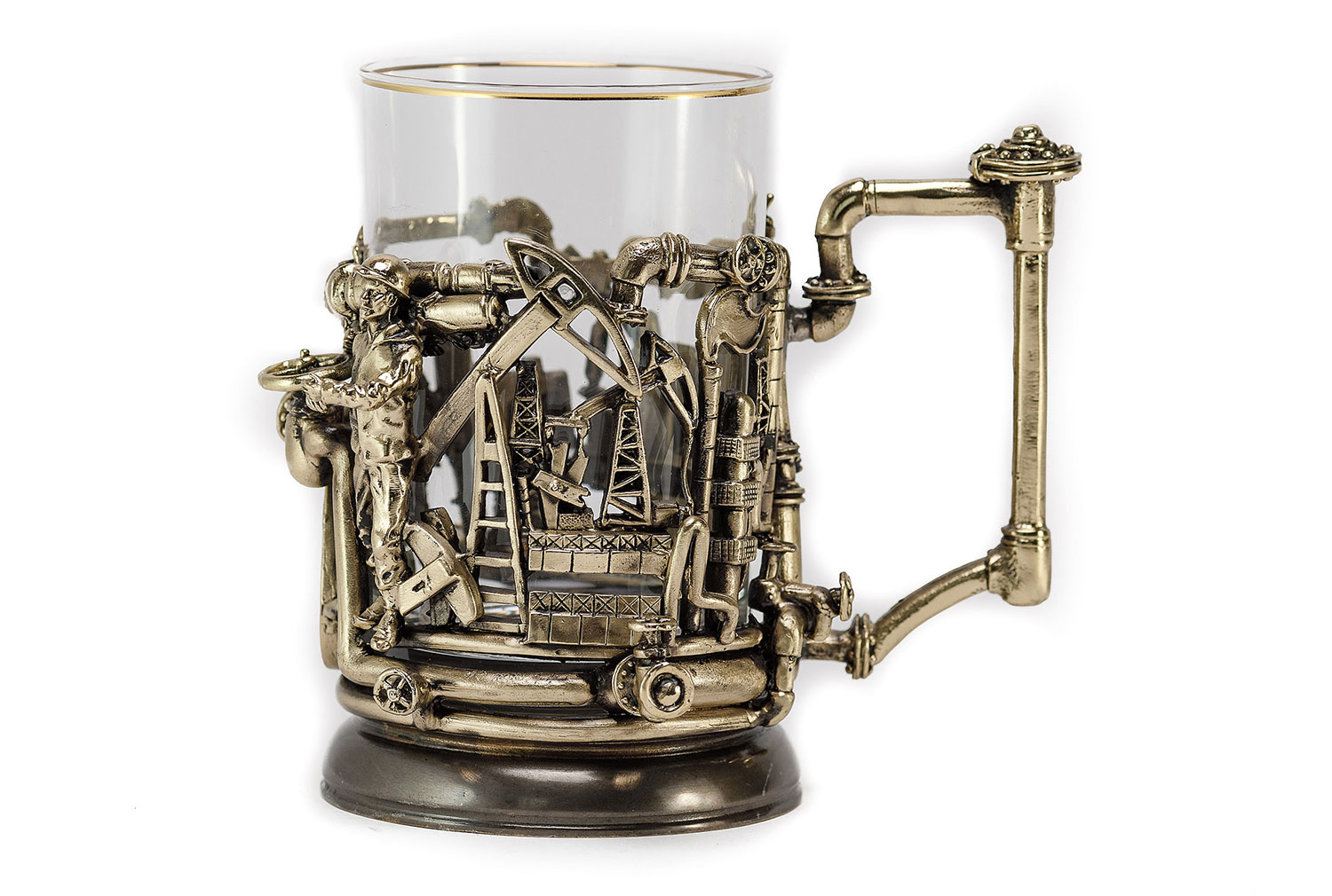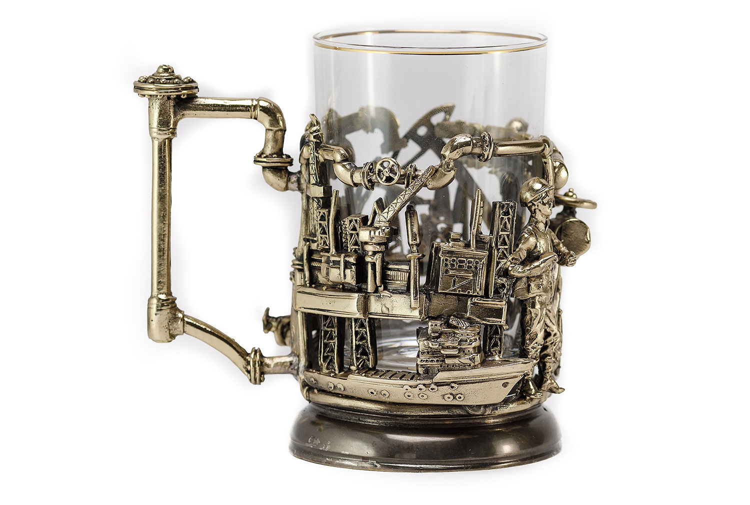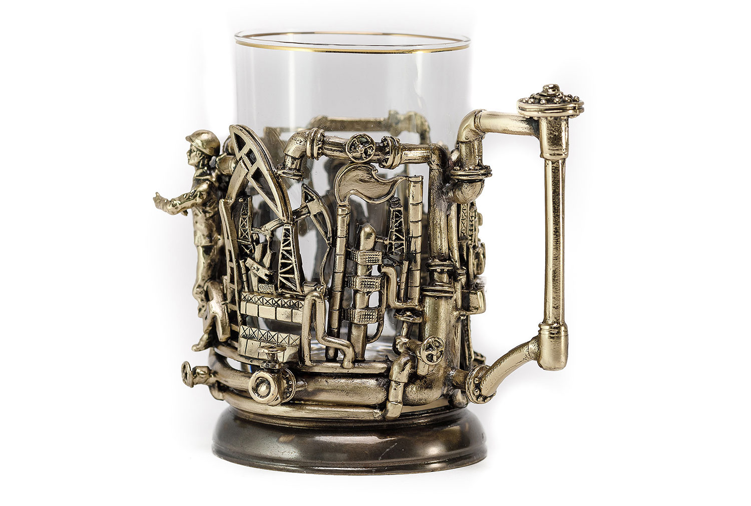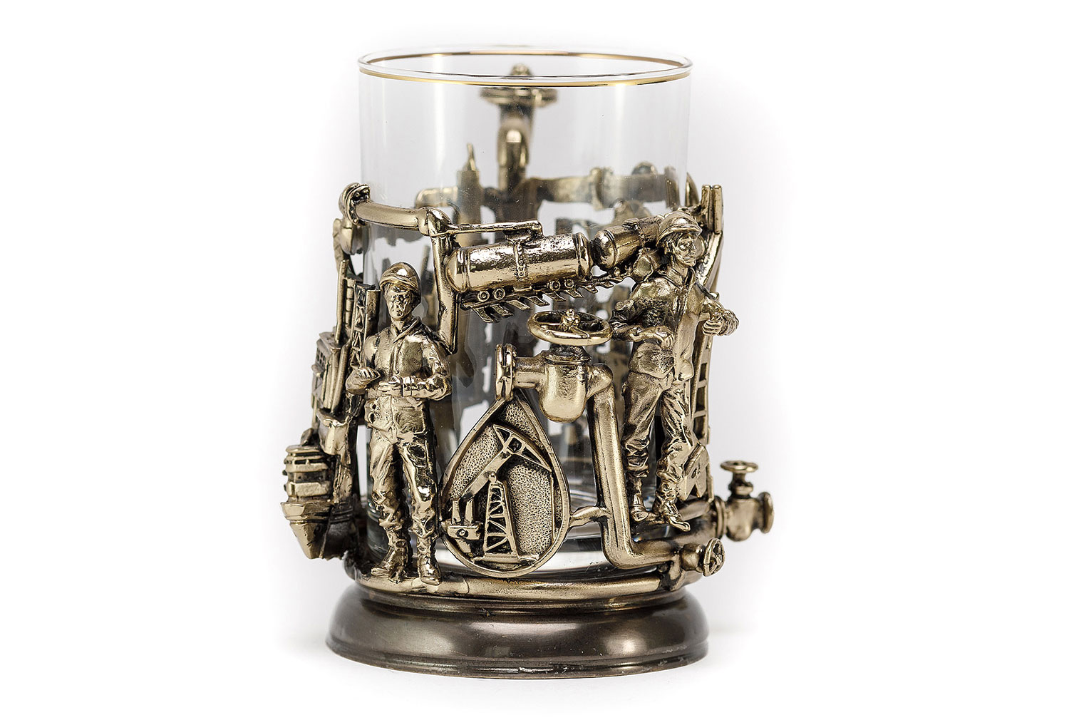 Подстаканник нефтяники, 250мл. Метод изготовления: художественное литье из латуни (ручная работа) Стакан: Стекло, Производитель: Неман, Страна: Беларусь, Объем: 250 мл Комплектация: Подстаканник латунь Так же Вы можете приобрести для подстаканника подарочную упаковку и ложечку