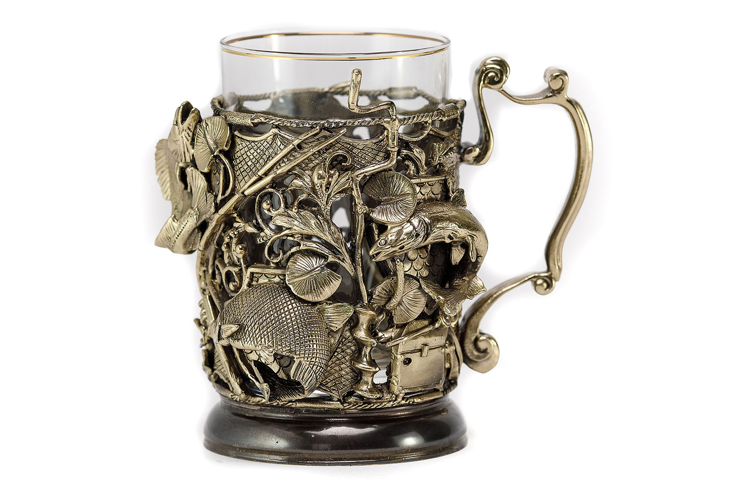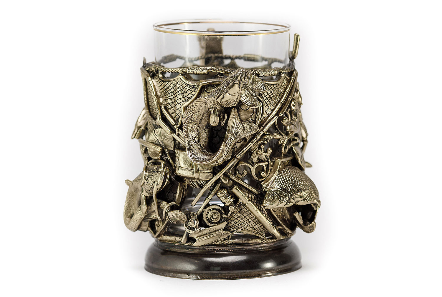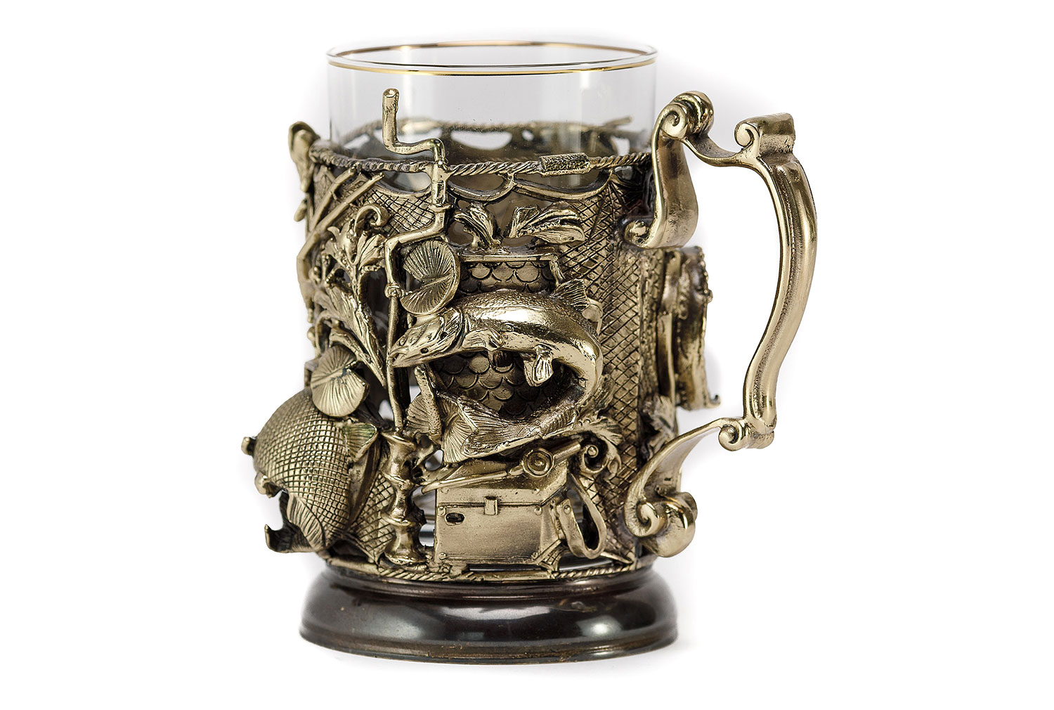 Подстаканник рыбалка трофейный. Метод изготовления:  художественное литье из латуни (ручная работа) Стакан: Стекло, Производитель: Неман, Страна: Беларусь, Объем: 250 мл  Комплектация:  Подстаканник латунь Так же Вы можете приобрести для подстаканника подарочную упаковку и ложечку