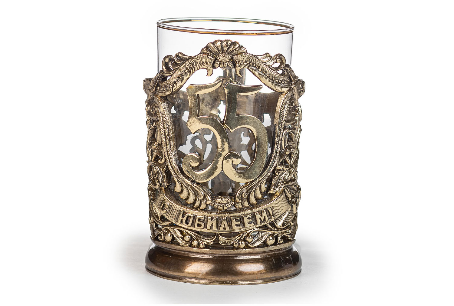 Подстаканник юбилейный 55лет, 250мл. Описание: Затейливый латунный узор, фигурная латунная ручка, на латунной ленте, опоясывающей подстаканник, написаны приятные юбиляру пожелания. В виньетке, похожей на золотую, латунные цифры 55, напоминающая о юбилее. Метод изготовления: художественное литье из латуни (ручная работа) Стакан: Стекло, Производитель: Неман, Страна: Беларусь, Объем: 250 мл Комплектация: Подстаканник латунь Так же Вы можете приобрести для подстаканника подарочную упаковку и ложечку