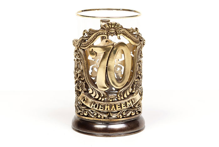 Подстаканник юбилейный 70. Описание: Изящный рисунок латунного кружева на подстаканнике, фигурная ручка, теплые пожелания юбиляру, написанные как бы золотом на более темном фоне, в виньетке - большая цифра 70. Достойный подарок достойному юбиляру, который будет с благодарностью вспоминать Вас, созерцая всю эту красоту во время чаепития. Метод изготовления:  художественное литье из латуни (ручная работа) Стакан: Стекло, Производитель: Неман, Страна: Беларусь, Объем: 250 м Комплектация:  Подстаканник латунь Так же Вы можете приобрести для подстаканника подарочную упаковку и ложечку