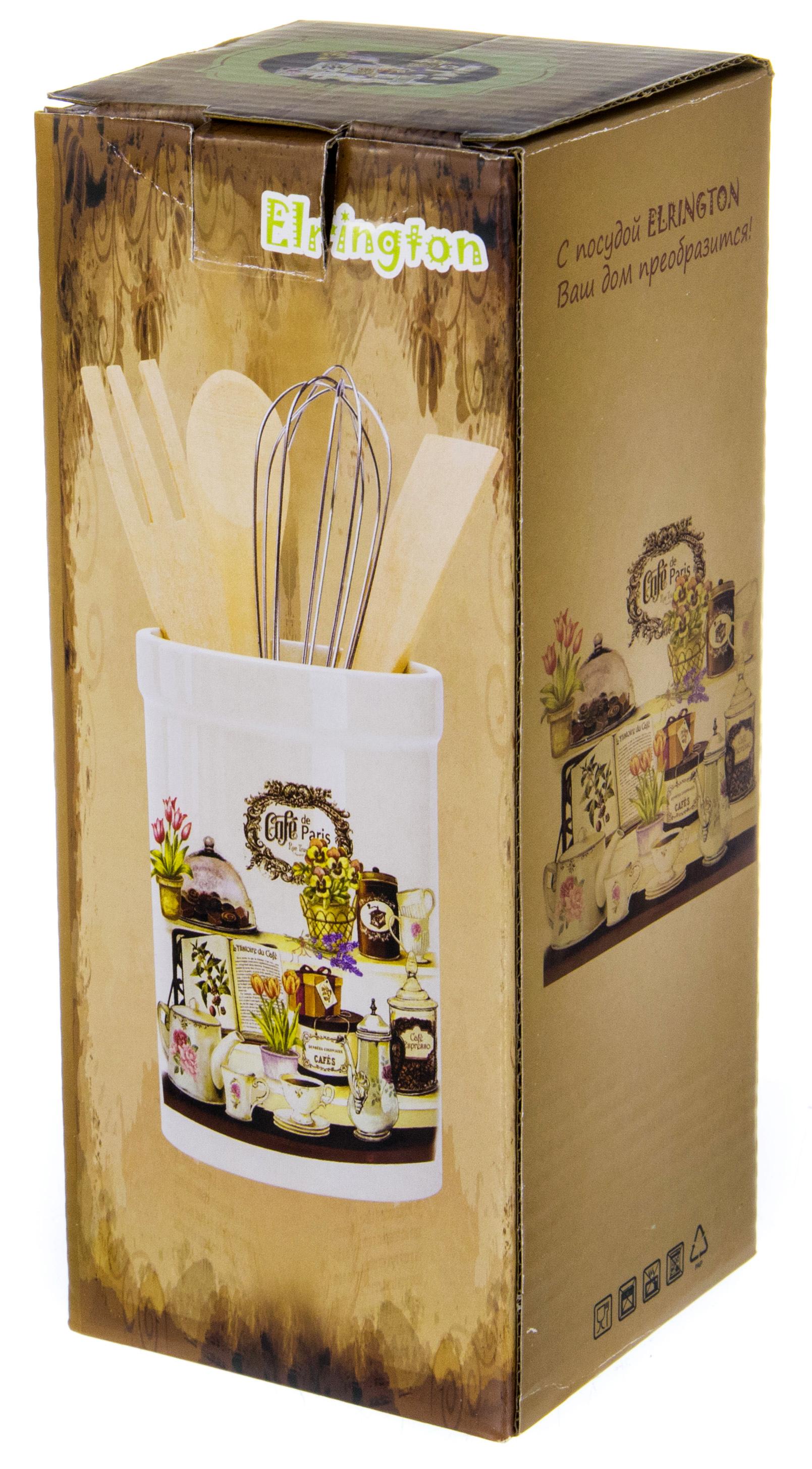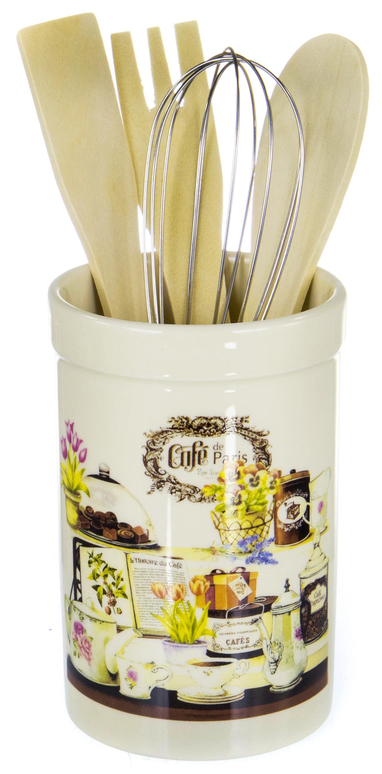 Держатель для столовых приборов 8,5х22см: 1 шт Деревянная ложка 20см 1 шт Деревянная вилка 20см 1 шт Деревянная лопатка 20см 1 шт Металлический венчик 20см 1 шт