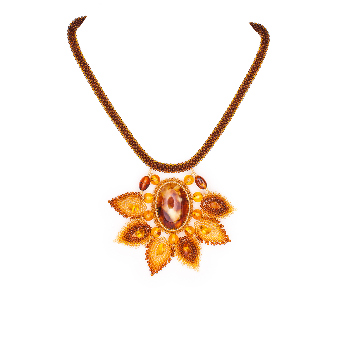 Колье с цветком из янтаря коньячного цвета с бисером.