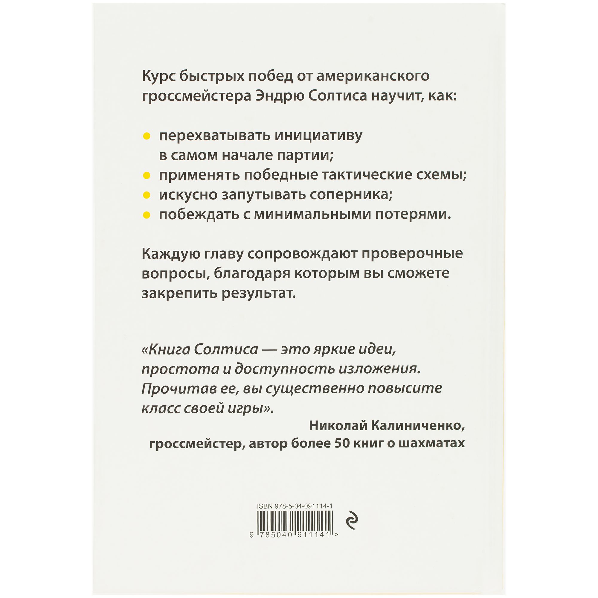 Размеры 24,2x16,8x2,6 см Вес (1 шт.) 593 г Транспортная упаковка 31,0x25,0x30,0 см Вес 16,60 кг Объем упаковки 0,023 м? Количество в упаковке 28 шт. Книга «365 способов быстро выигрывать в шахматы» — фундаментальный шахматный задачник. Представленные здесь партии демонстрируют важные концепции и содержат комбинации, которые нужно обязательно знать всем, кто желает добиться успеха в этой игре. Курс быстрых побед научит, как перехватывать инициативу, применять победные тактические схемы, искусно запутывать соперника и побеждать с минимальными потерями — и эти навыки пригодятся не только за шахматной доской. Автор Эндрю Солтис, издательство «Эксмо». Твердый переплет, 384 страницы.