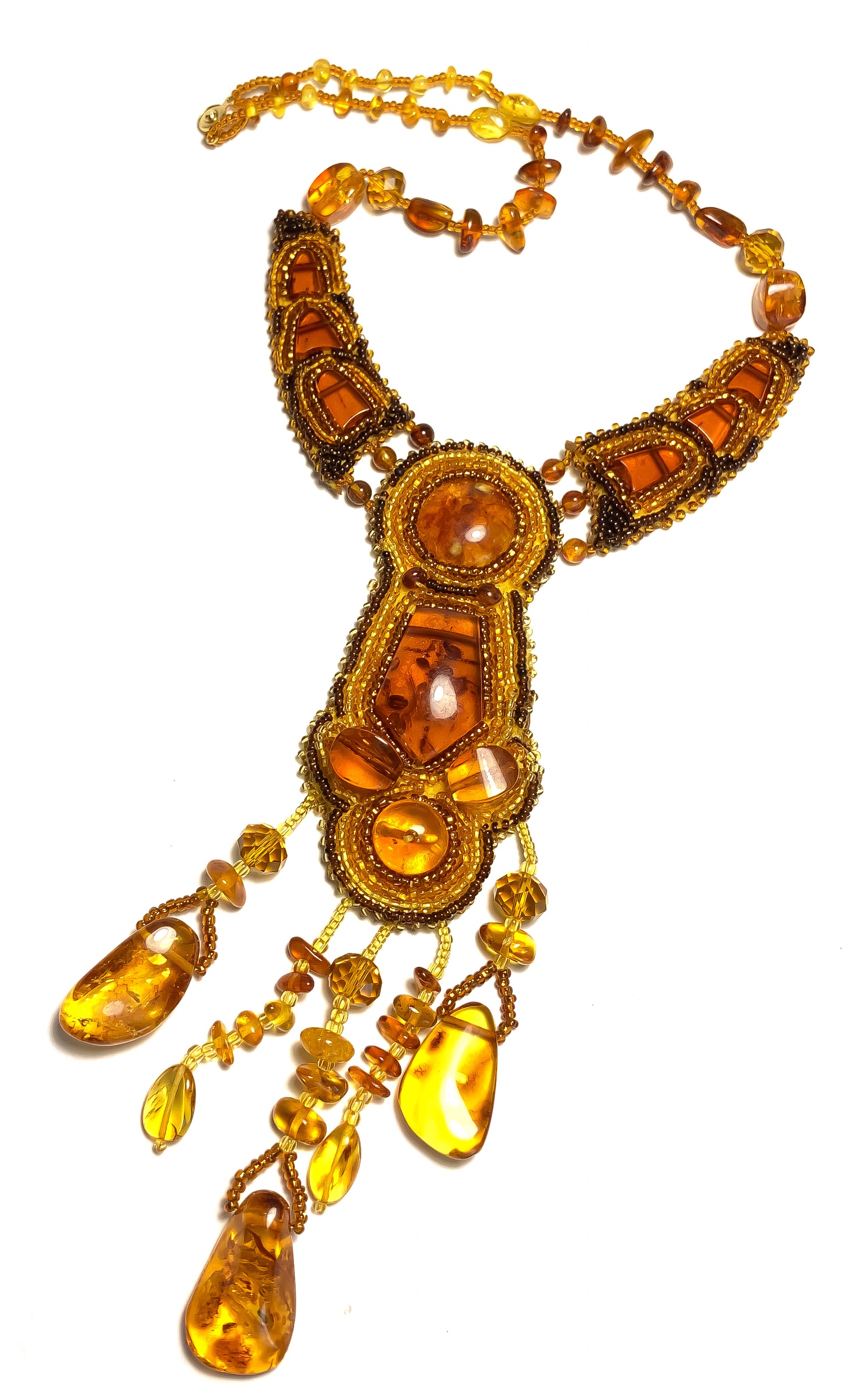 Колье в этническом стиле из янтаря, стекла, бисера и натуральной кожи