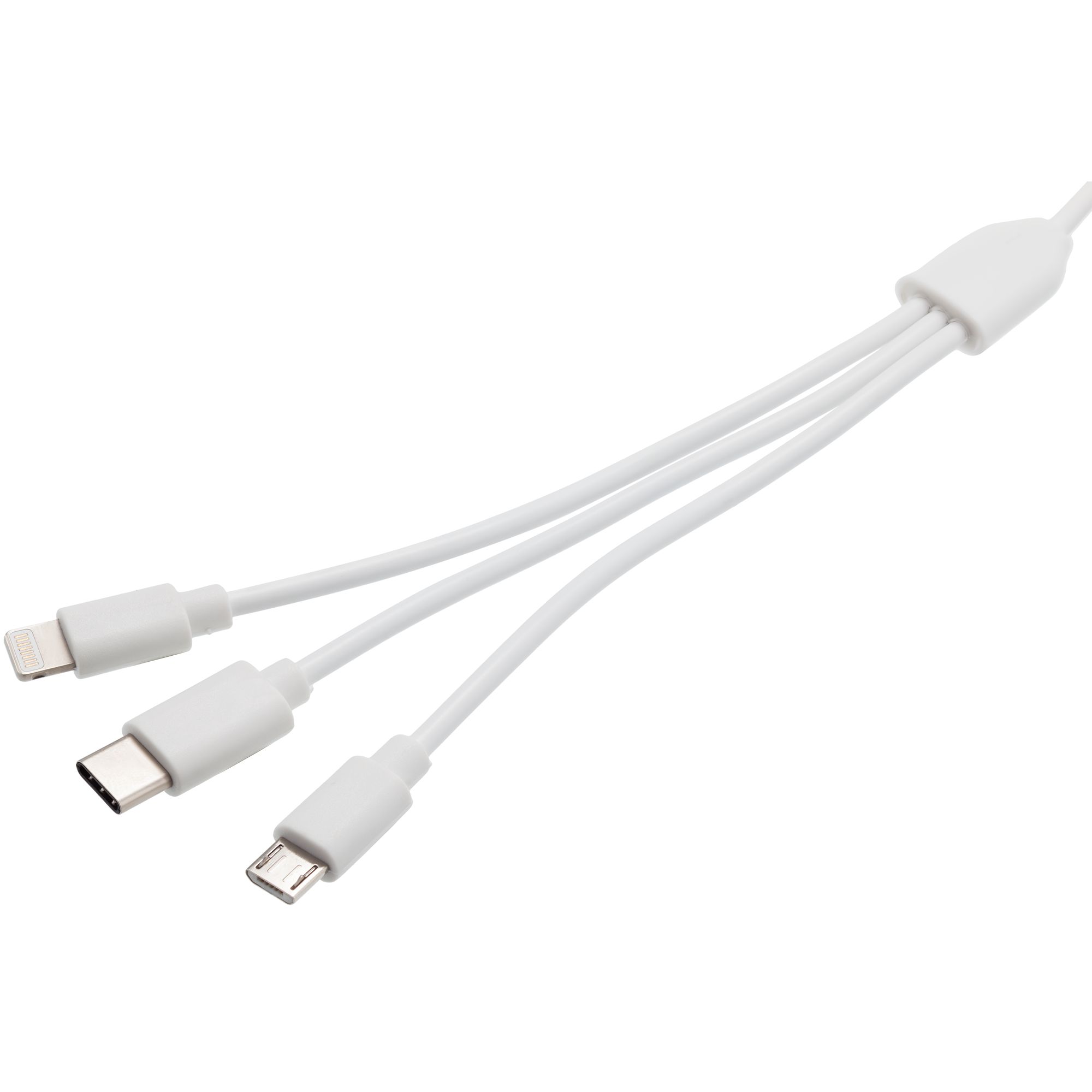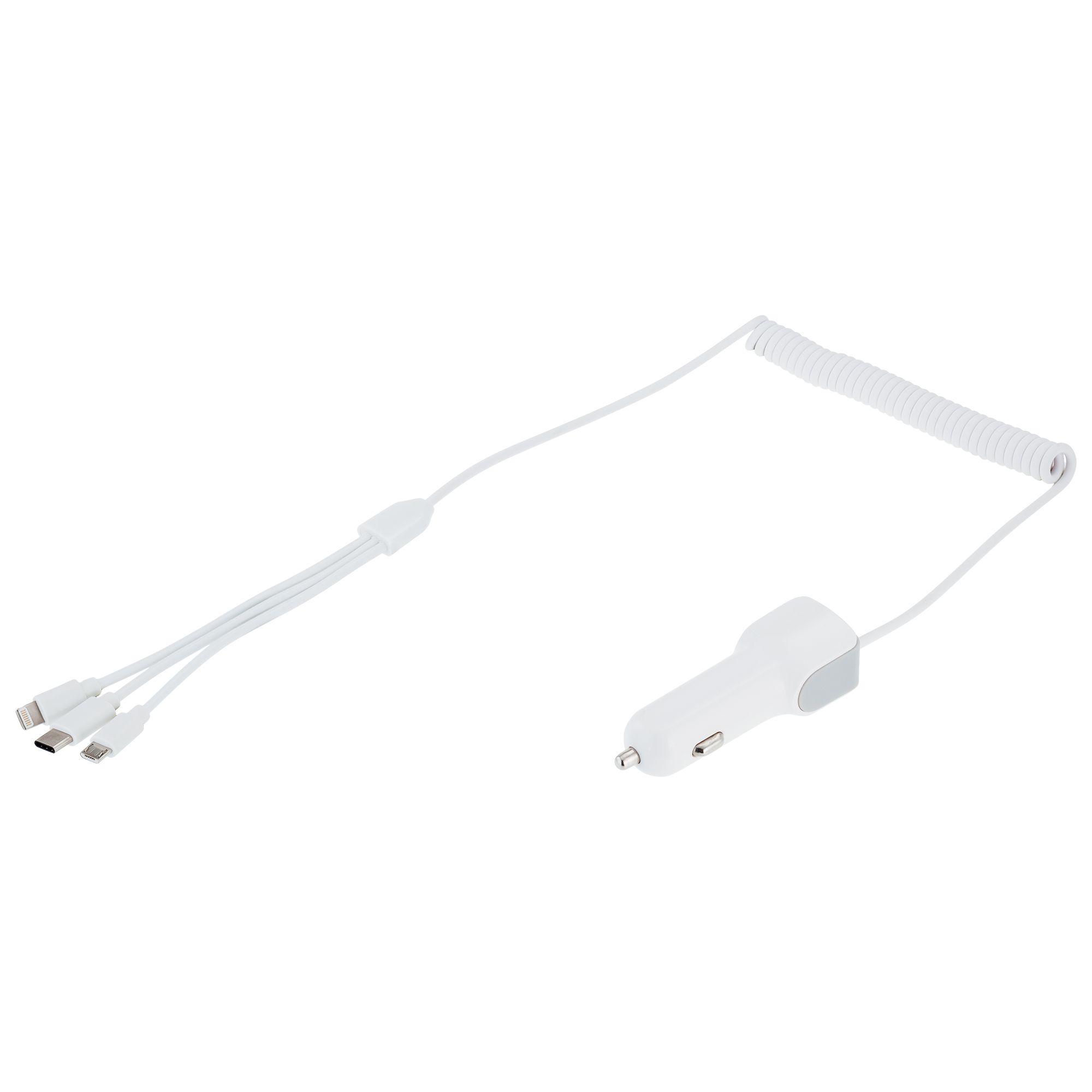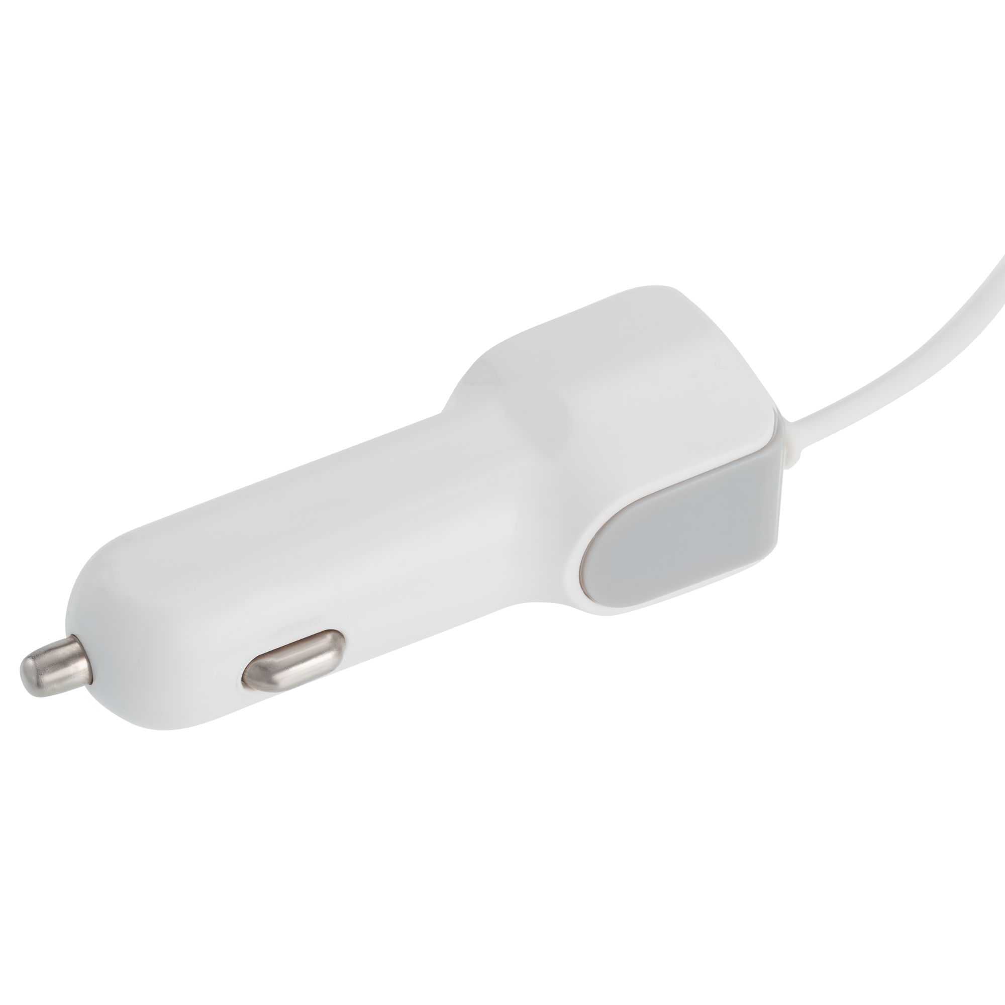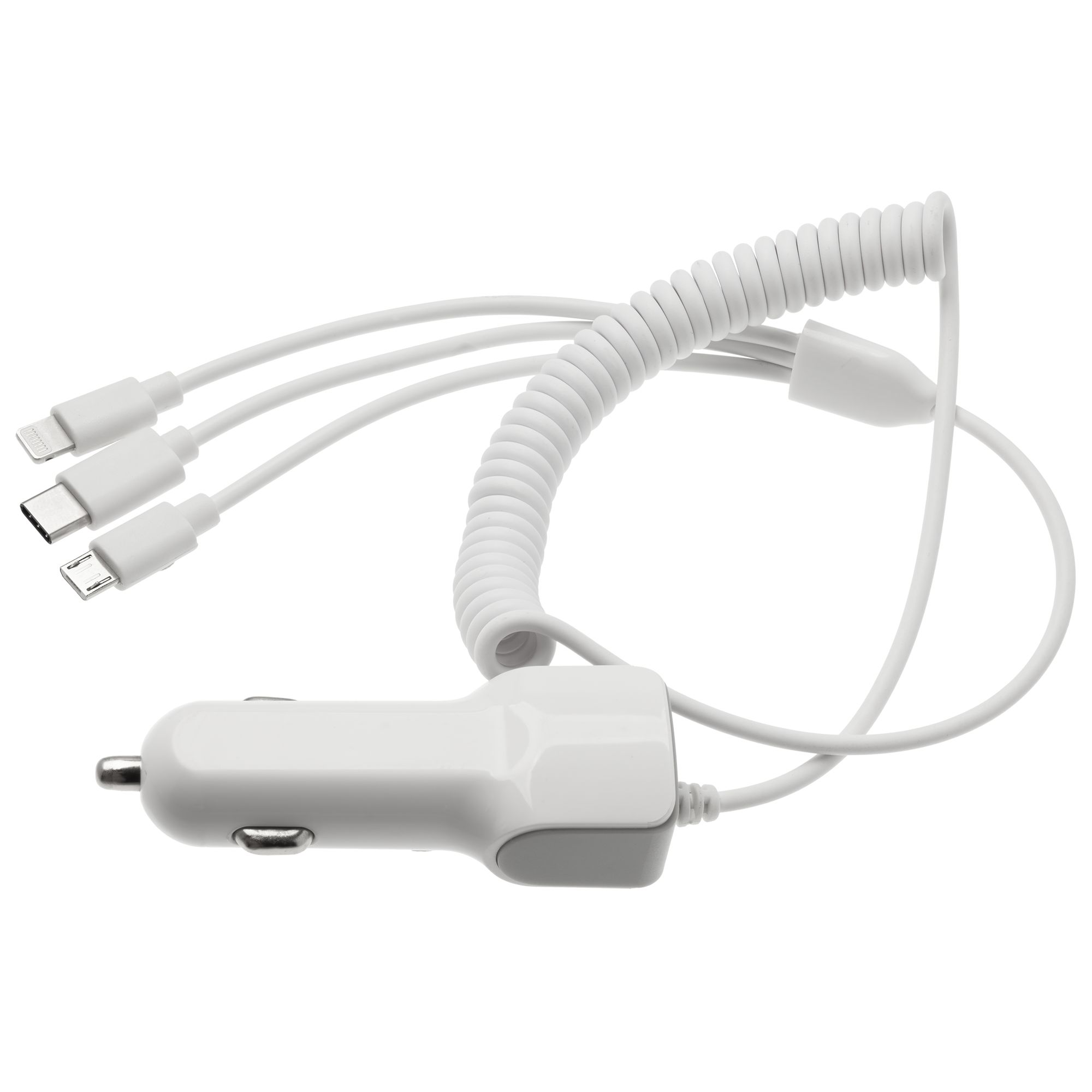 Автомобильное зарядное устройство high ride, белое. Размеры 7,8x2,7x1,8 см, минимальная длина шнура 62 см, максимальная длина шнура 200 см; упаковка: 13,8x6,8x3,7 см Материал АБС-пластик Вес (1 шт.) 20,00 г Транспортная упаковка 28,0x35,0x22,0 см Вес 2,00 кг Объем упаковки 0,022 м? Количество в упаковке 100 шт. Виды нанесения A2-Тампопечать (1 цвет) Устройство-переходник с портом USB и шнуром с разъемами Type-C, Micro USB и Lightning. Подключается к прикуривателю автомобиля и используется для зарядки мелкой электроники. USB-порт; Несъемный шнур с разъемами Type-C, Micro USB и Lightning; Входные параметры: 12–24 B, 0,35 А; Выходные параметры: 5 В, 2,1 А.