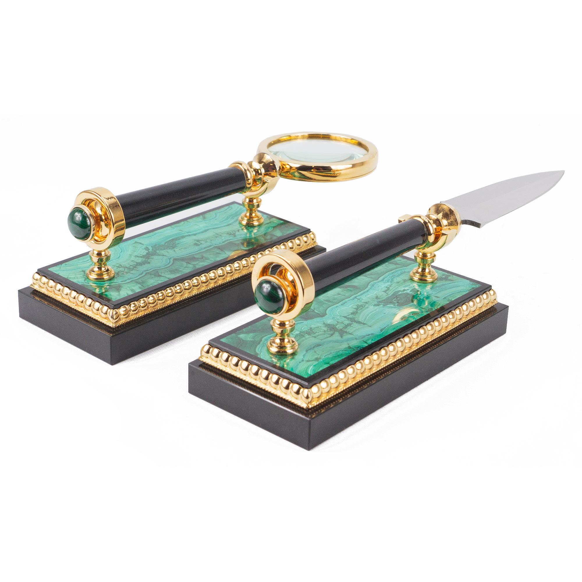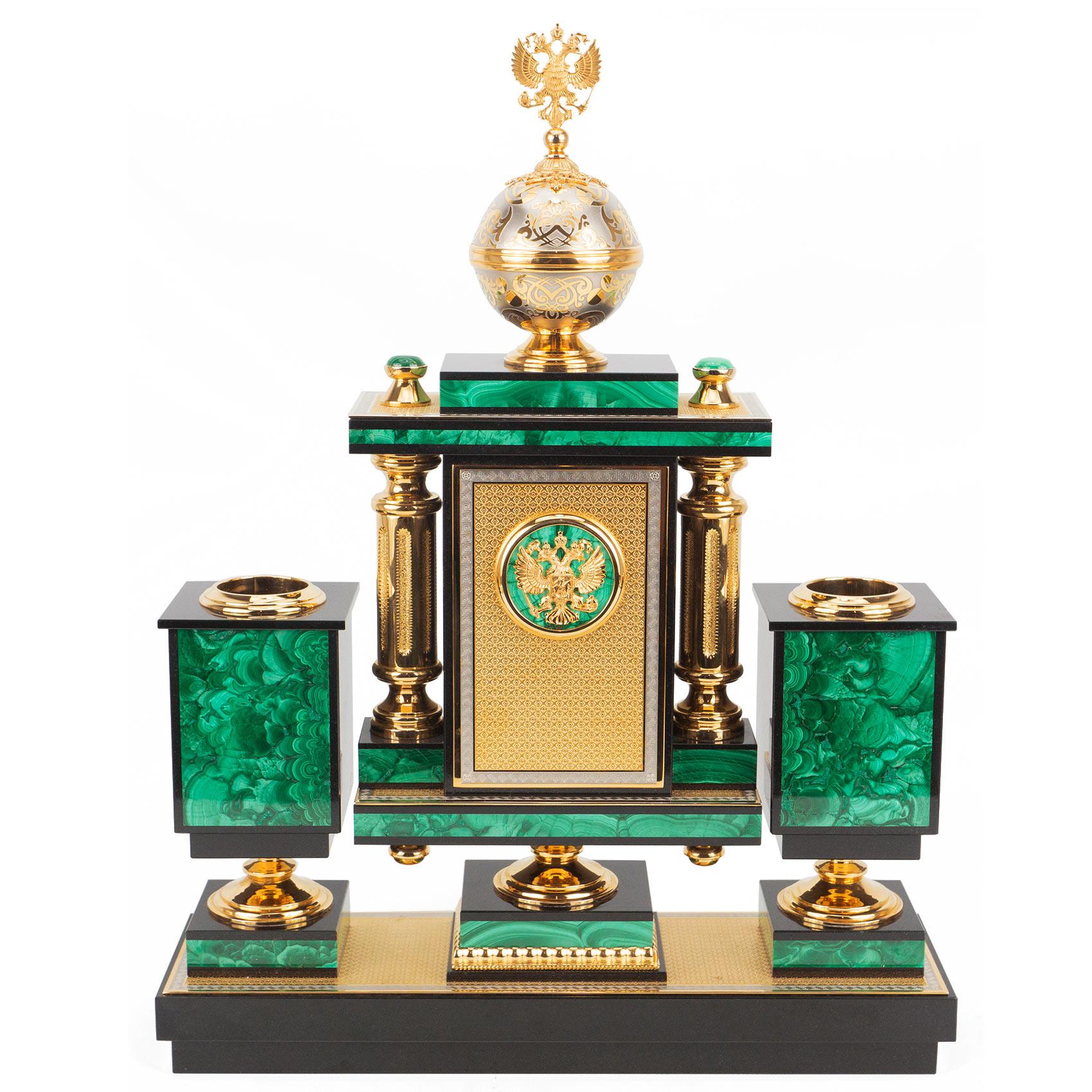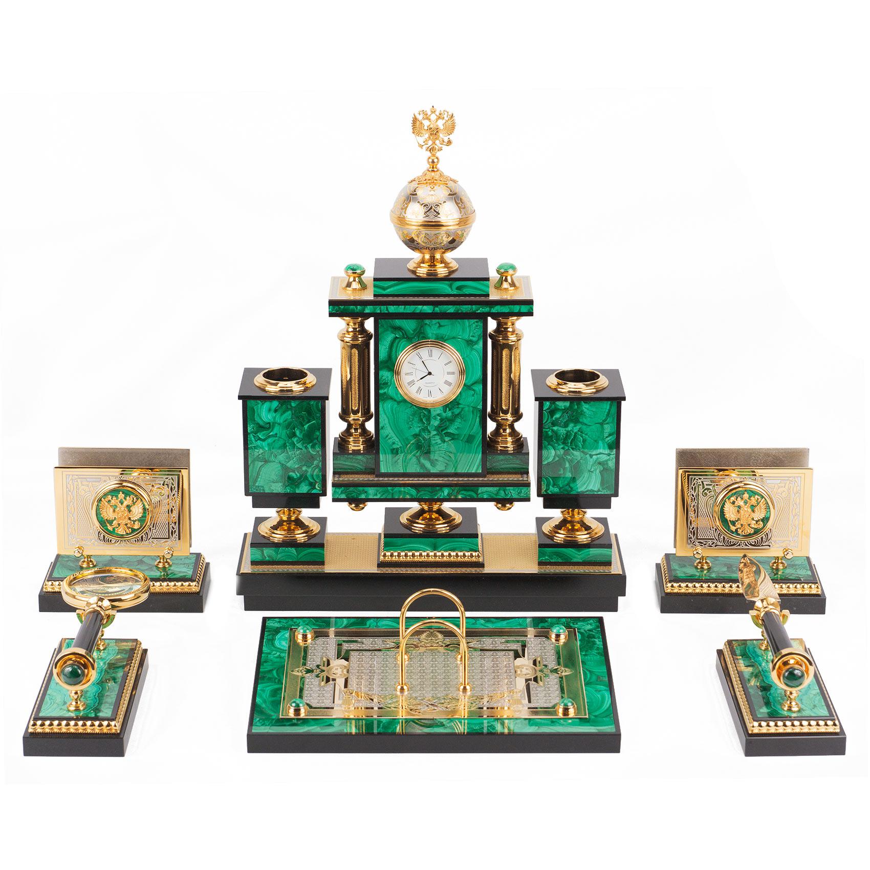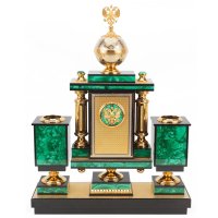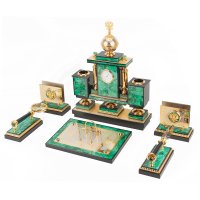 Настольный набор держава камень малахит. Вес 28 кг Размер часы 30х9х40 см, визитница 13х7х12 см, календарница: 26х18х3 см, нож 24х3х2 см, лупа 20х7х2 см. Материал малахит, долерит, бронза, никель, покрытие золотом (999,9).  развернуть описание ▼