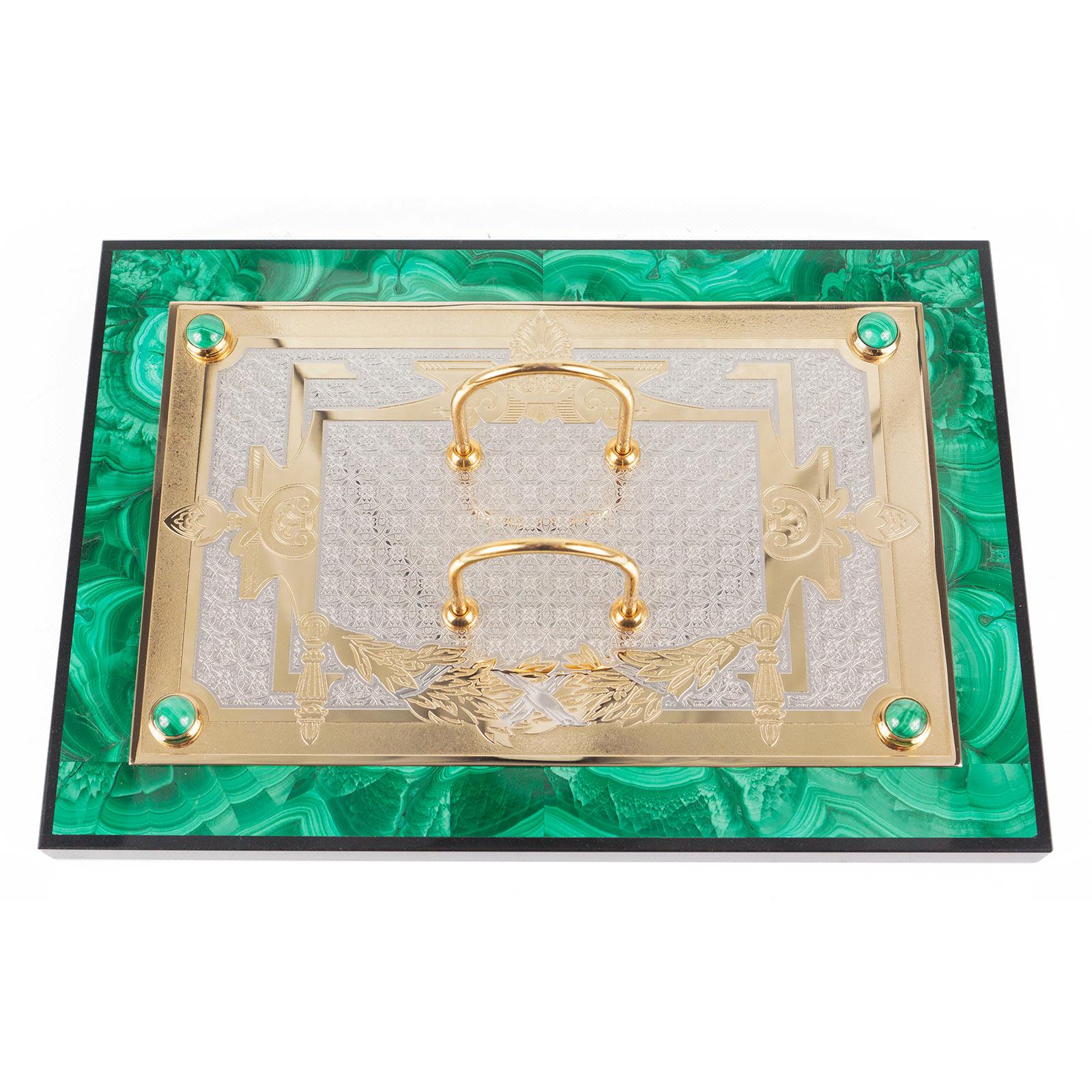 Материал: малахит, долерит, бронза, никель, покрытие золотом (999,9).