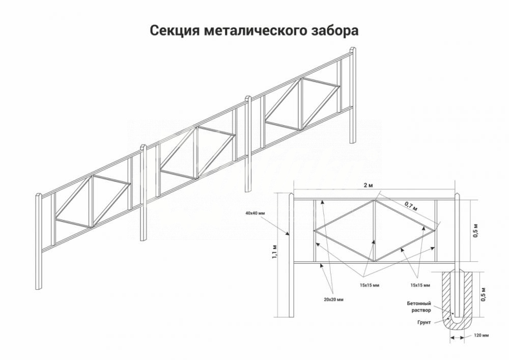 Секция забора тип-4. Подробные характеристики Размеры секции: Длина: 2000 мм H: 600 мм h углубления: 500 мм Профиль труб: 40x40 мм, 20x20 мм, 15x15 мм
