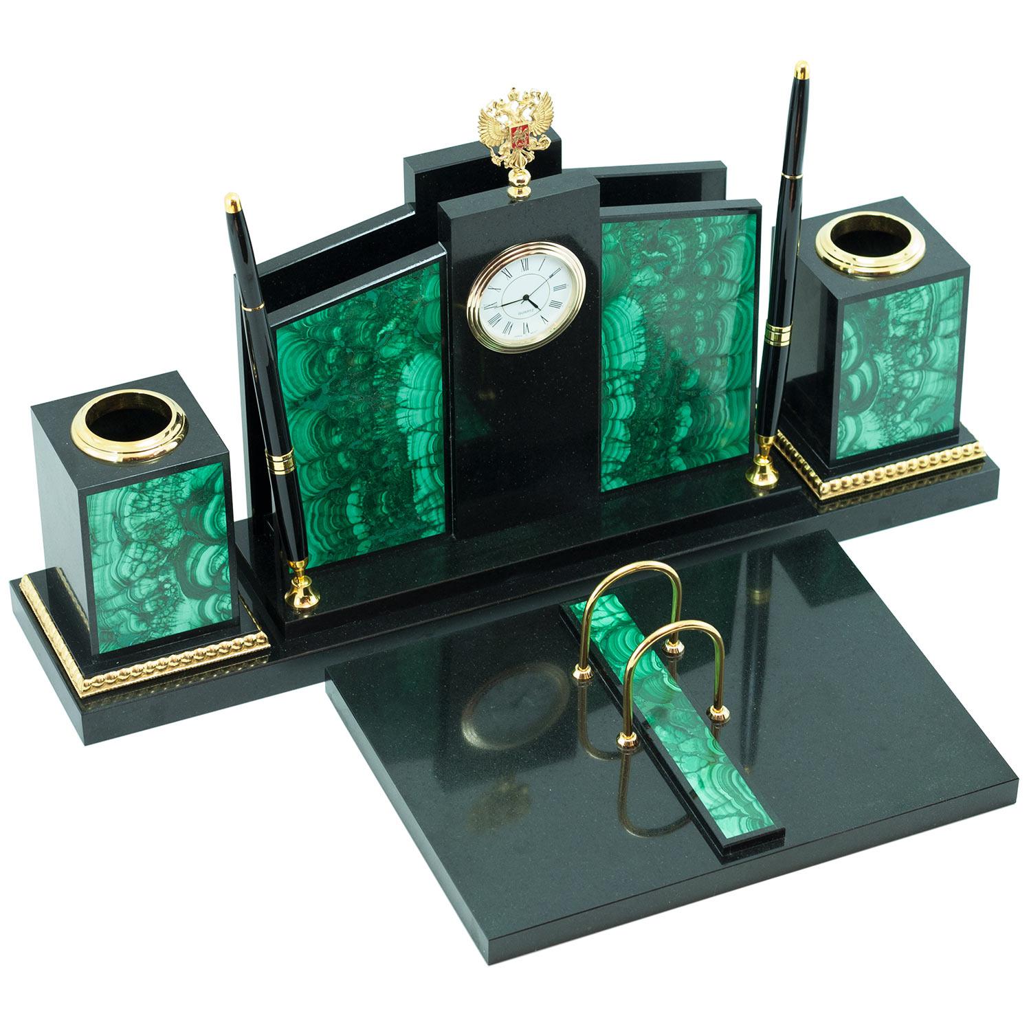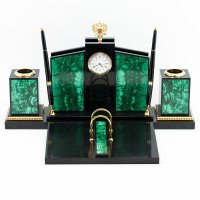 Настольный набор герб камень малахит. Вес 11000 г Размер часы 44х10х22,5 см, календарница 23,5х16х2,5 см Материал малахит, долерит, бронза, никель, покрытие золотом (999,9).  развернуть описание ▼