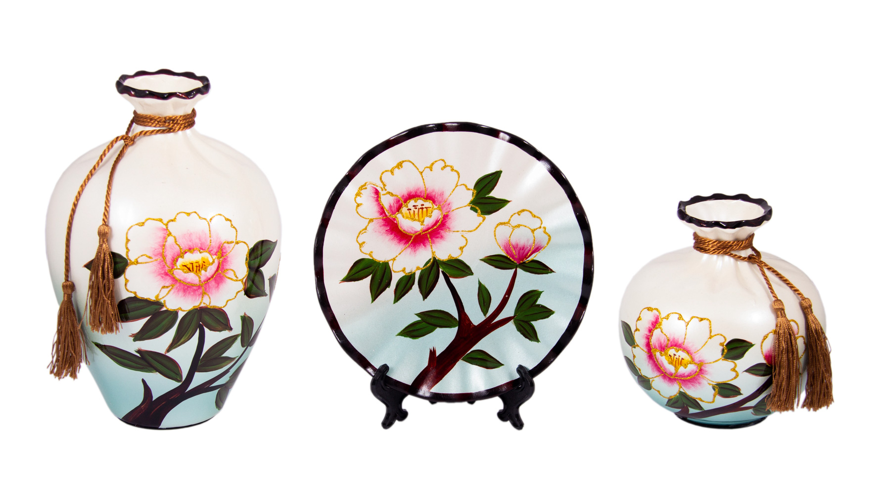 Подарочный набор: тарелка декор. 21см, ваза 20см, ваза 25см. Артикул: 114918 Материал: Керамика Назначение: Гостиная, Кухня, Прихожая Направленность: Женские, Молодежные Праздник: 8 марта, День учителя, 1 сентября Сертификация: Товар не подлежит обязательной сертификации. Состав: керамика.