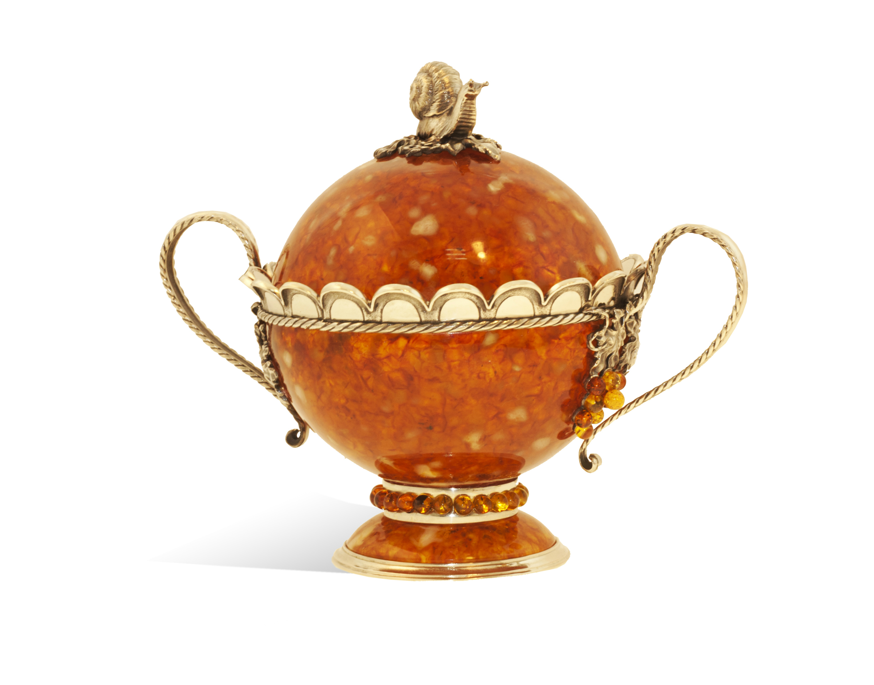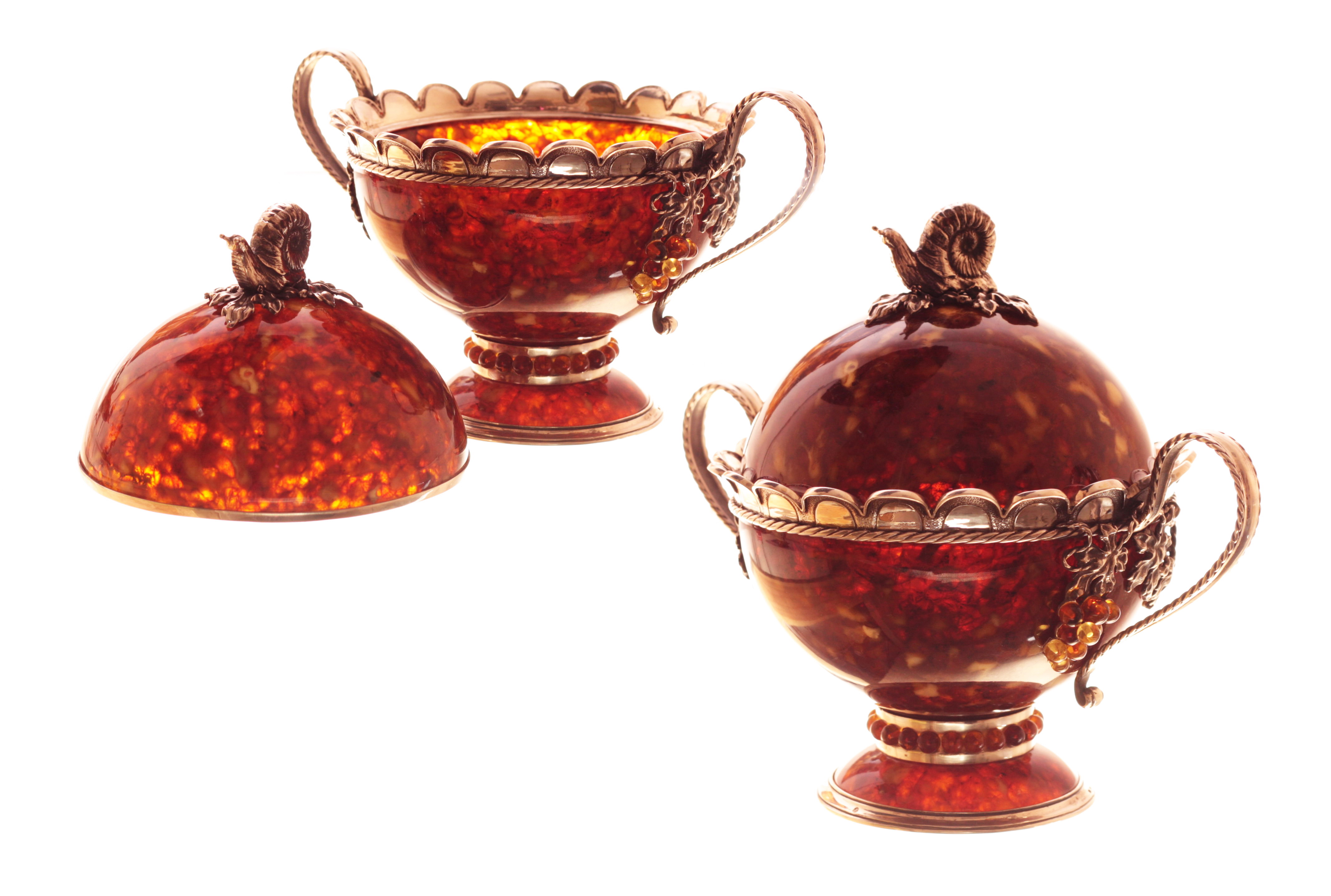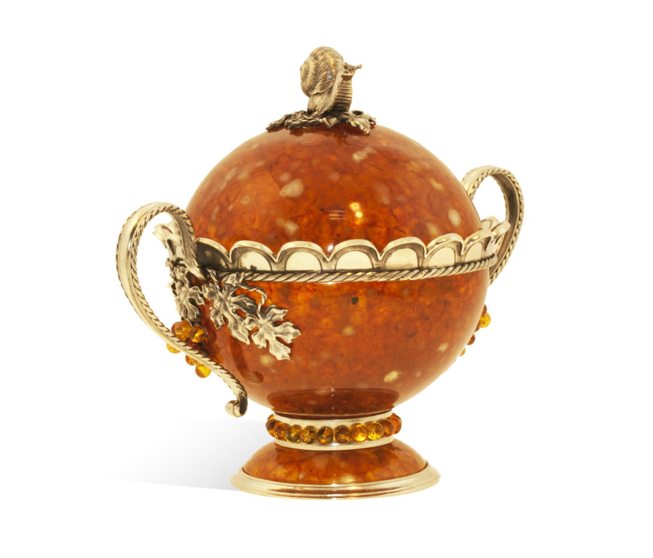Бонбоньерка (сахарница) "виноград" из янтаря. Высота: 17,0 см, диаметр: 13,0 см (с ручками 20,5 см) Состав: натуральный янтарь,белая ювелирная бронза или серебро 875 пробы. Вес серебра в изделии - 350 гр. Поставляется в подарочном футляре. В случае отсутствия товара на складе срок изготовления от трех недель.