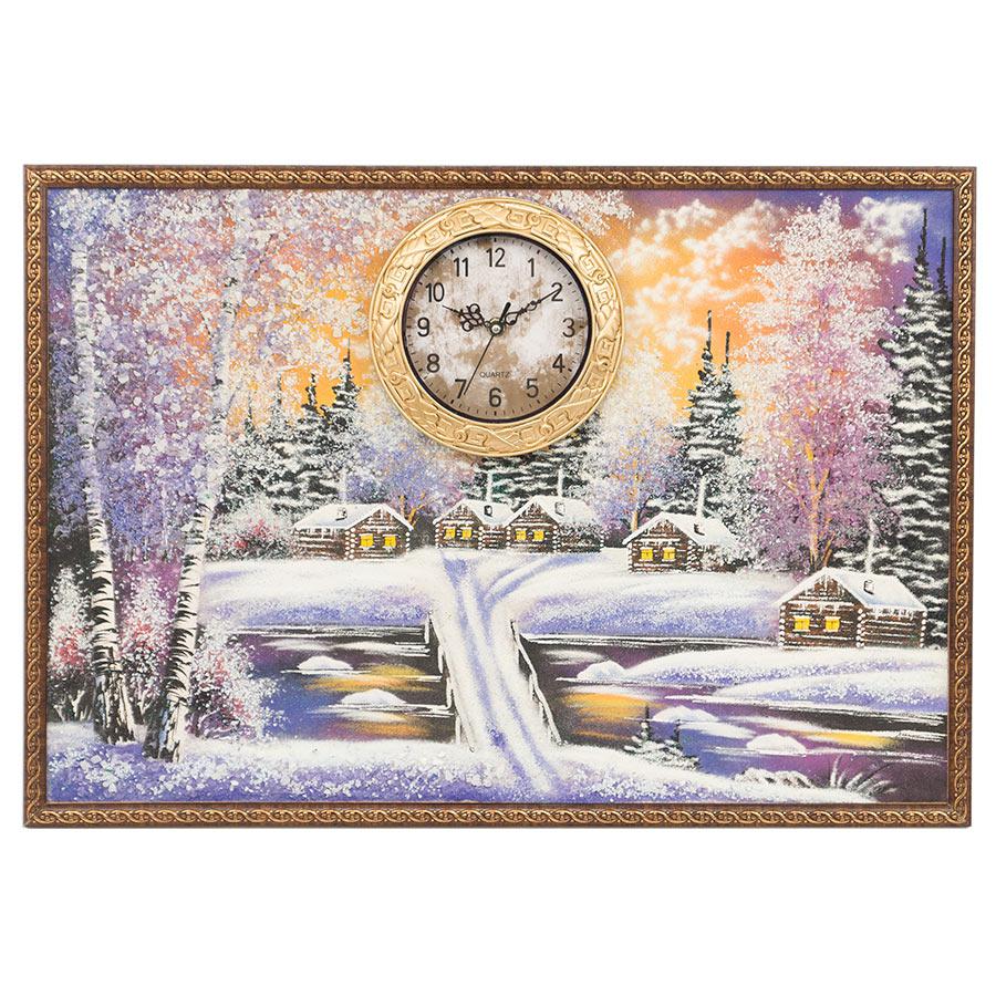 Часы с картиной домики в зимнем лесу 45х65 см.
