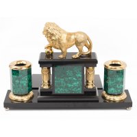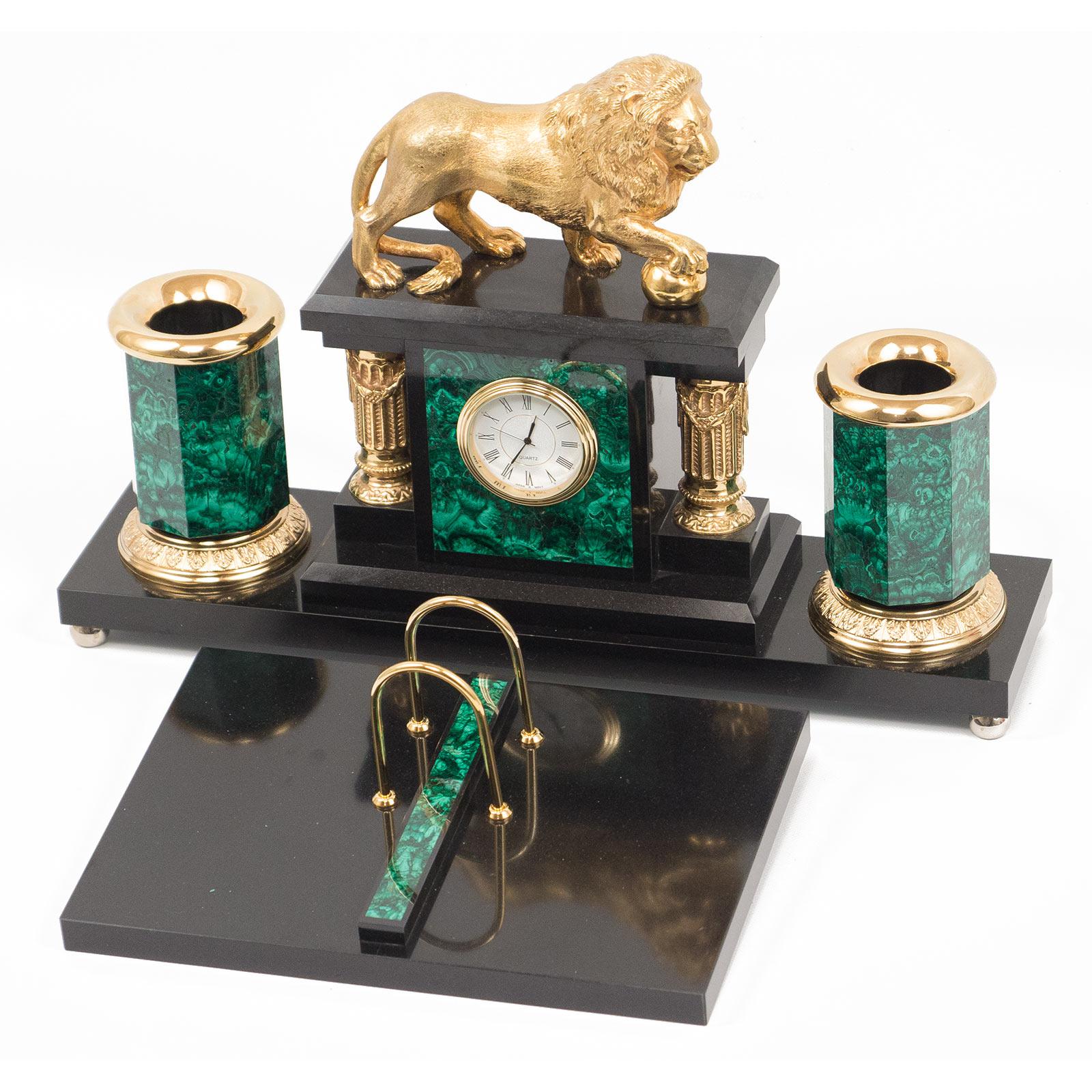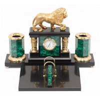 Настольный набор лев малахит позолота. Вес 11 кг Размер часы 38х10х28,5 см, подставка под календарь 24х15х2,5 см. Материал малахит, долерит, бронза, никель, покрытие золотом (999,9).  развернуть описание ▼