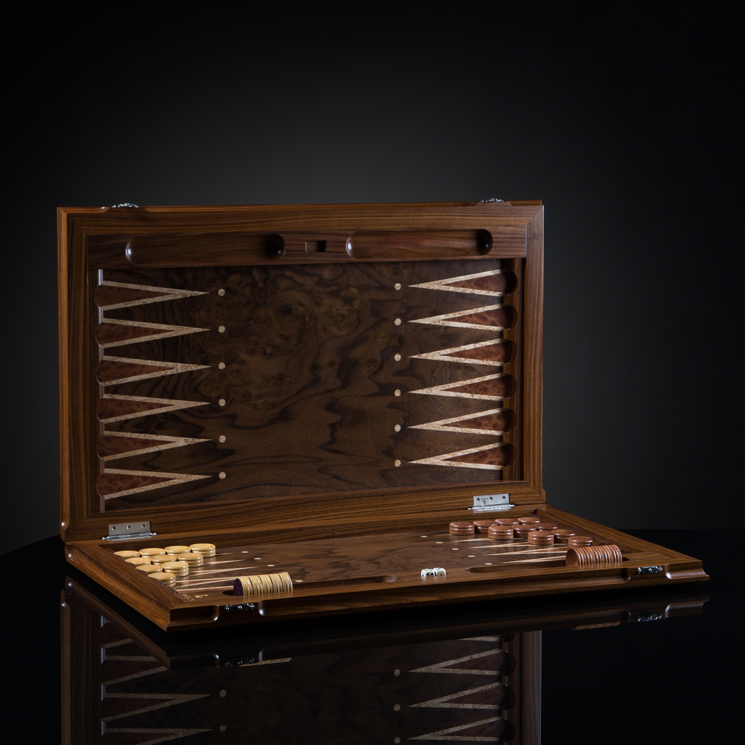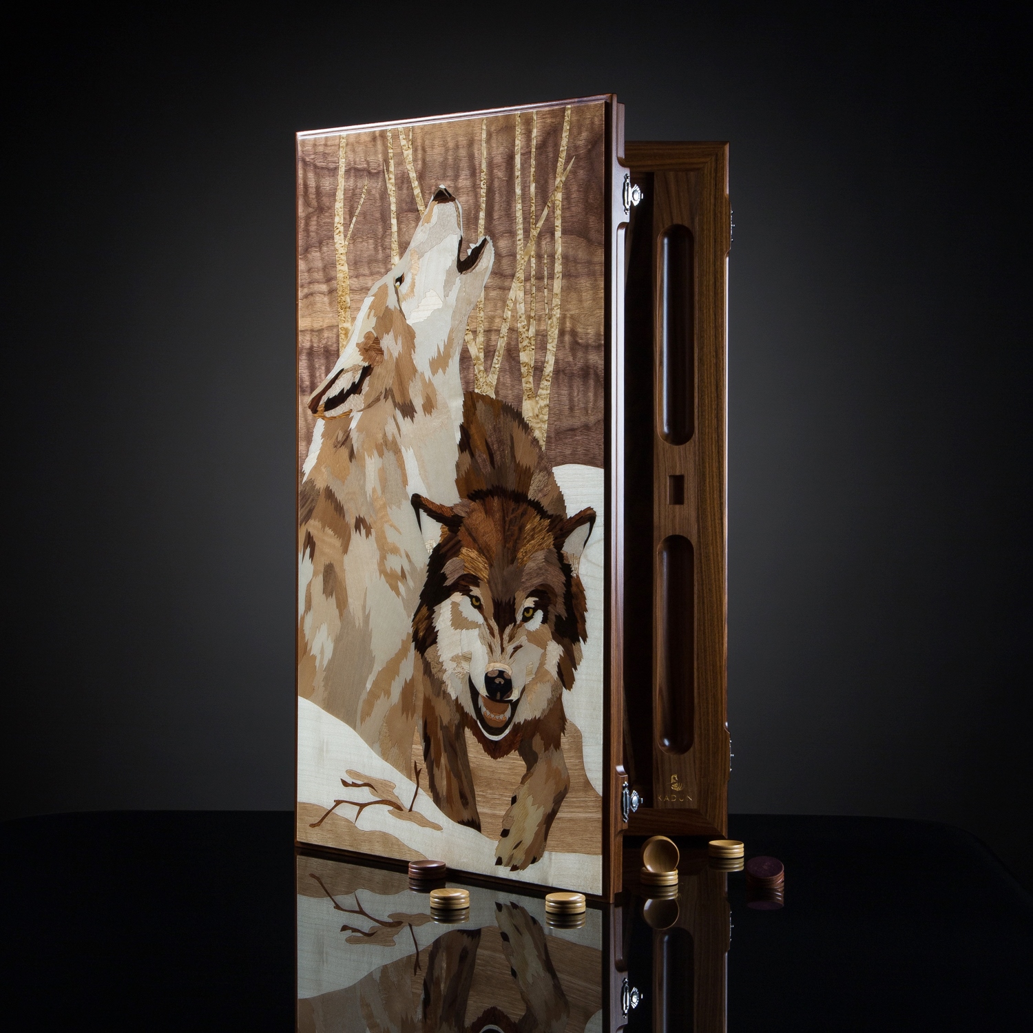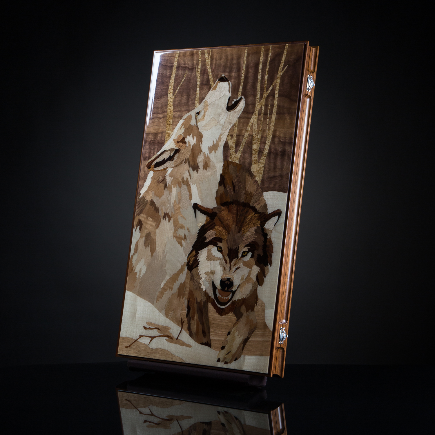 Нарды "волки" из палисандра kadun. корпус - палисандр сантос, рисунок в технике маркетри (мозаика) лицевая сторона – бубинга, падук, венге, орех, ироко, вишня,сикамора,кото,мербау,карельская береза,американский орех,бубинга отделка - рояльный лак (полиэфир) поле внутри – корень американского ореха, корень ильма, карельская береза кейс ручной работы из массива тонированного ясеня, мягкий ложемент шашки светлые - колхидский самшит, темные - красное дерево, подклеены замшей фурнитура - серебро кубики - обсидиан размер - 365*610 мм