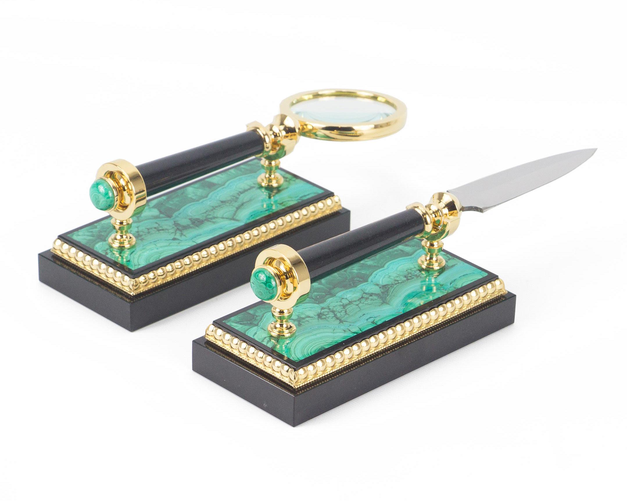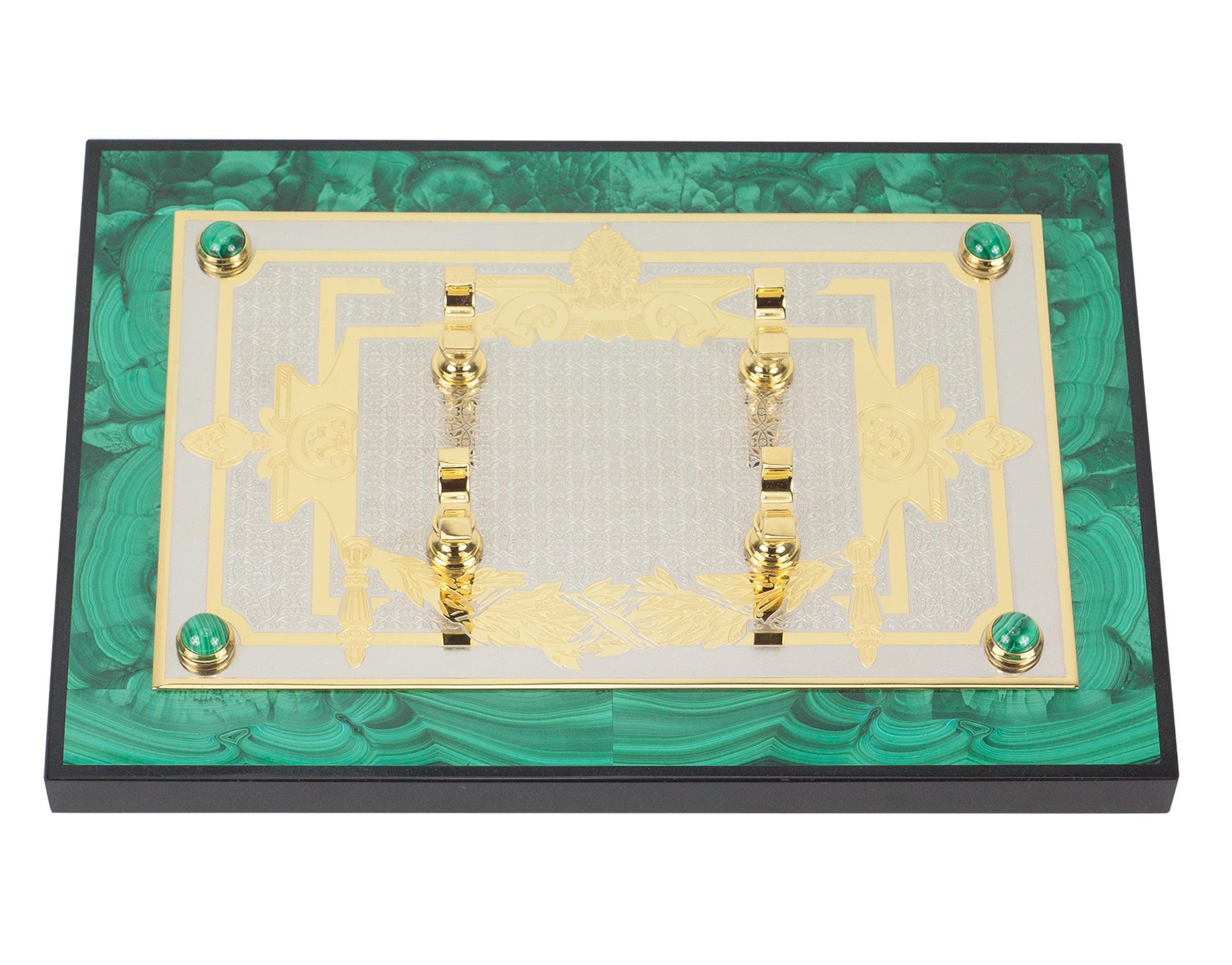Материал: малахит, долерит, бронза, никель, покрытие золотом (999,9).