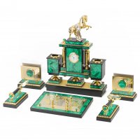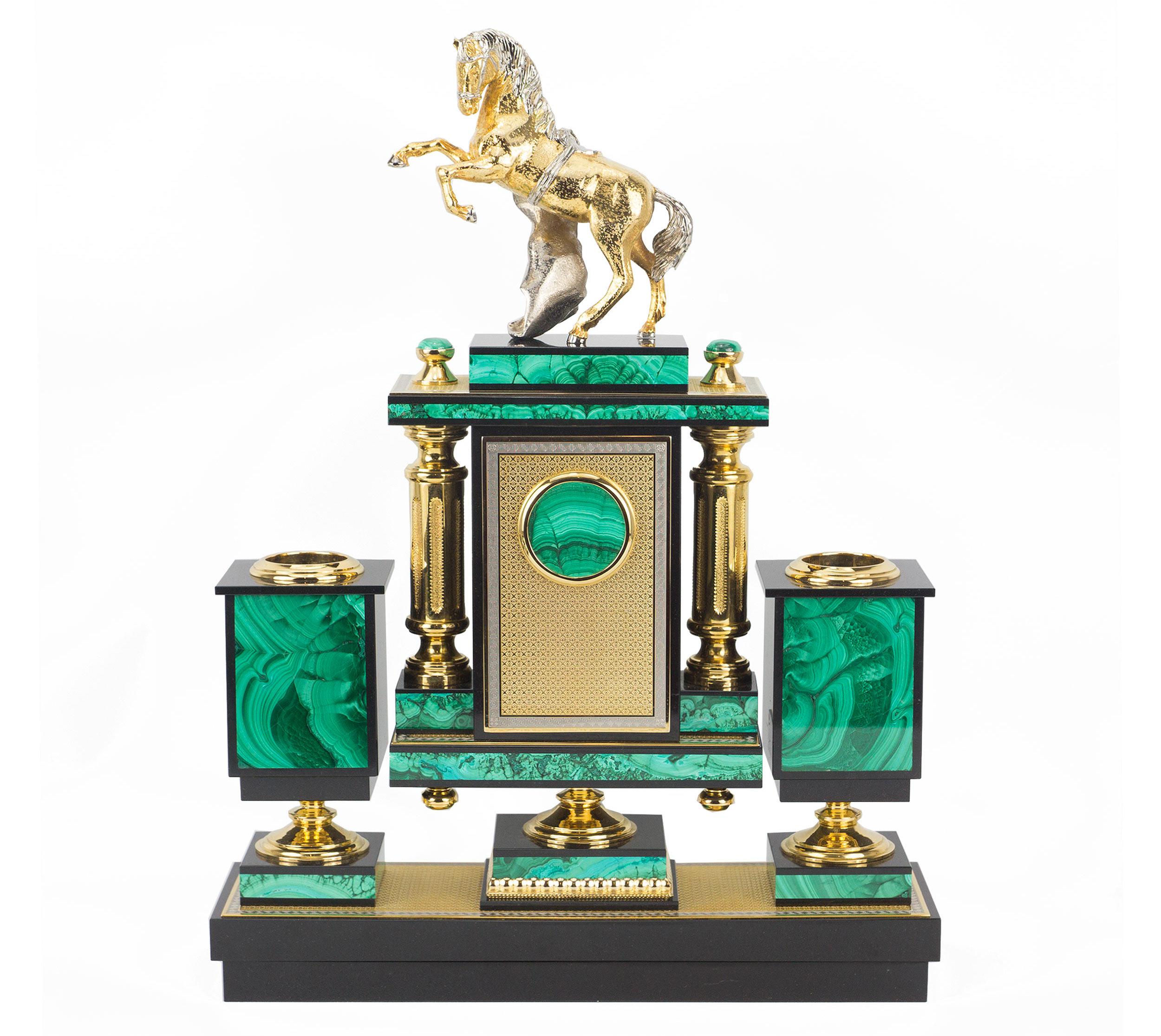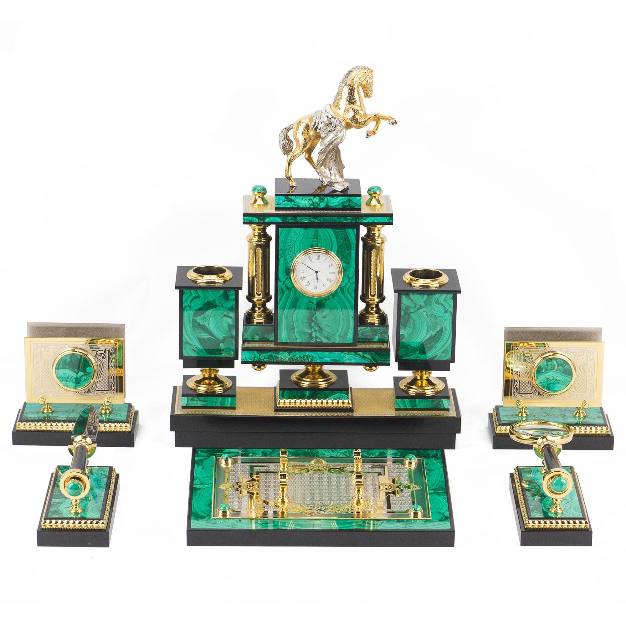 Настольный набор конь с попоной малахит позолота. Вес 27 кг Размер часы 31х9х42 см, визитница 13х7х12 см, календарница 26х18х3 см, нож 24х3х2 см, лупа 20х7х2 см. Материал малахит, долерит, бронза, никель, покрытие золотом (999,9).  развернуть описание ▼