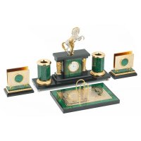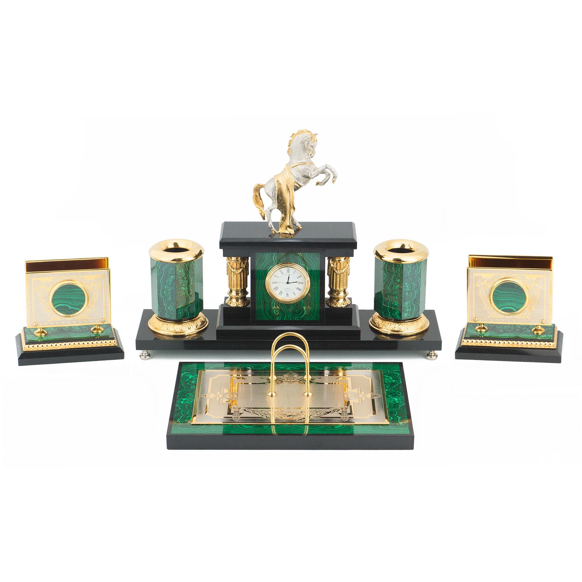 Настольный набор конь с попоной малахит позолота. Вес 16000 г Размер часы 38х9,5х28 см, подставка под визитки 13х7х12 см, подставка под календарь 26х18х3 см. Материал малахит, долерит, бронза, никель, покрытие золотом (999,9).  развернуть описание ▼