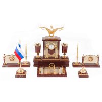 Настольный набор двуглавый орел яшма позолота. Вес 22000 г Размер часы 32х11х38,5 см, визитница 24,5х8х11 см, календарница 24,5х16,5х3,5 см, печать 8х8х8,5 см, флагшток 8х8х32 см. Материал яшма, бронза, никель, покрытие золотом (999,9).  развернуть описание ▼