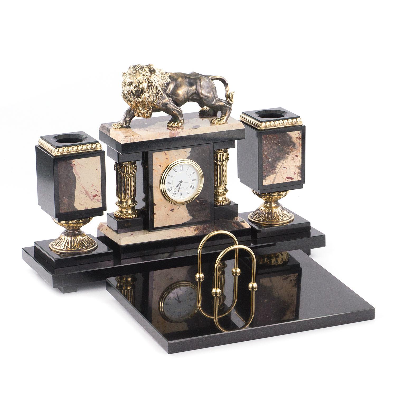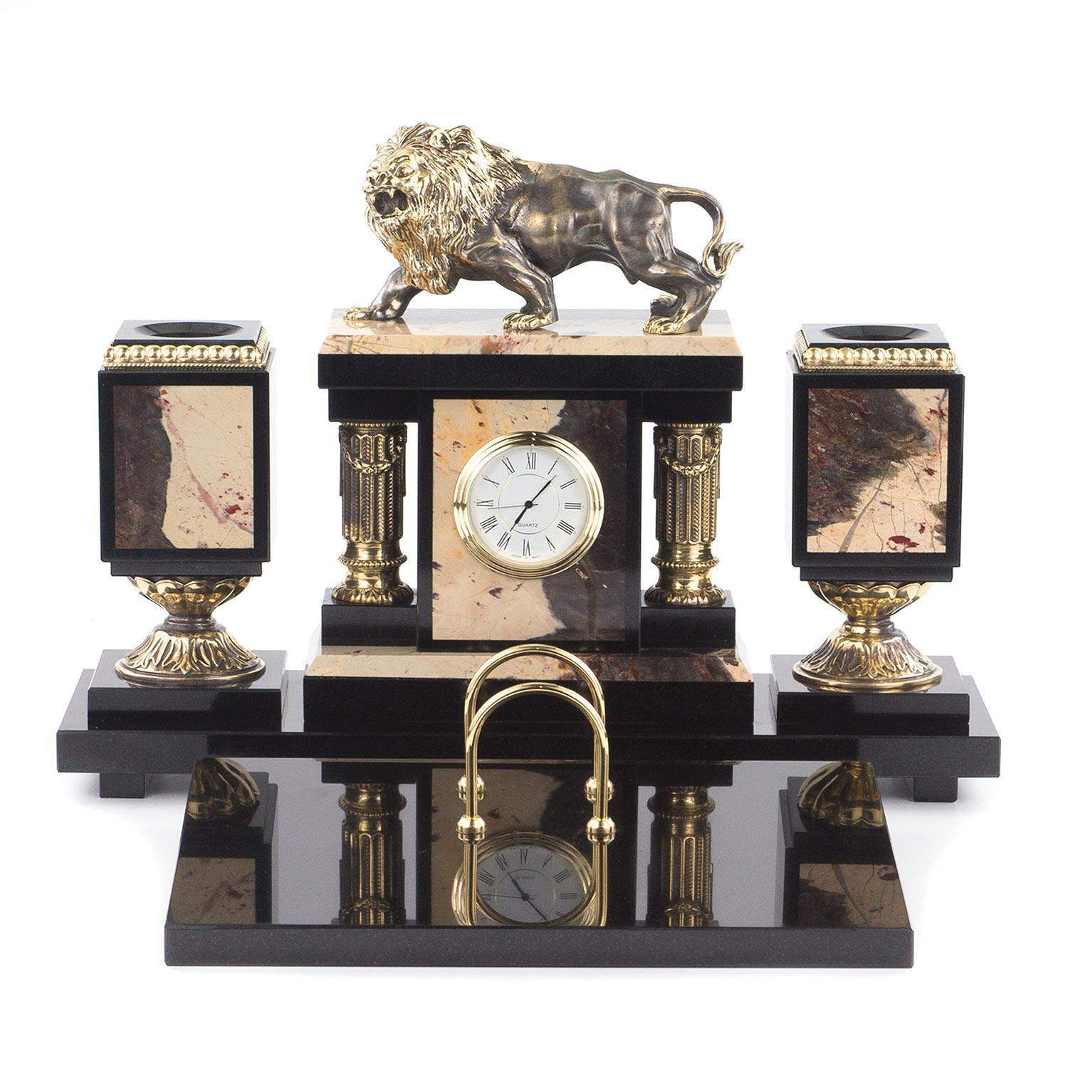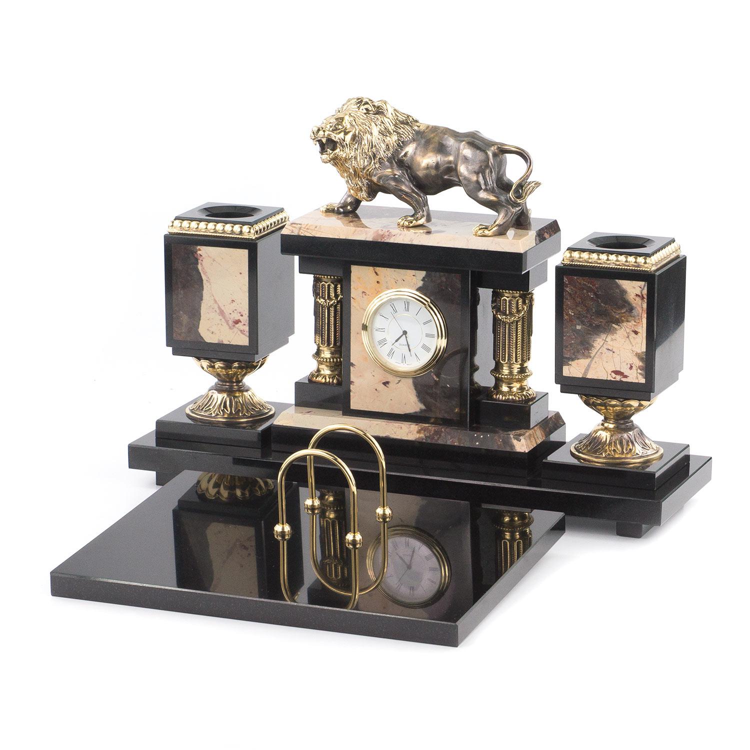 Настольный набор лев яшма долерит бронза патина 345х290х240 мм. Вес 14000 г Размер часы 34,5х11х24 см, календарница 24х18х3 см Материал яшма, долерит, бронза  развернуть описание ▼