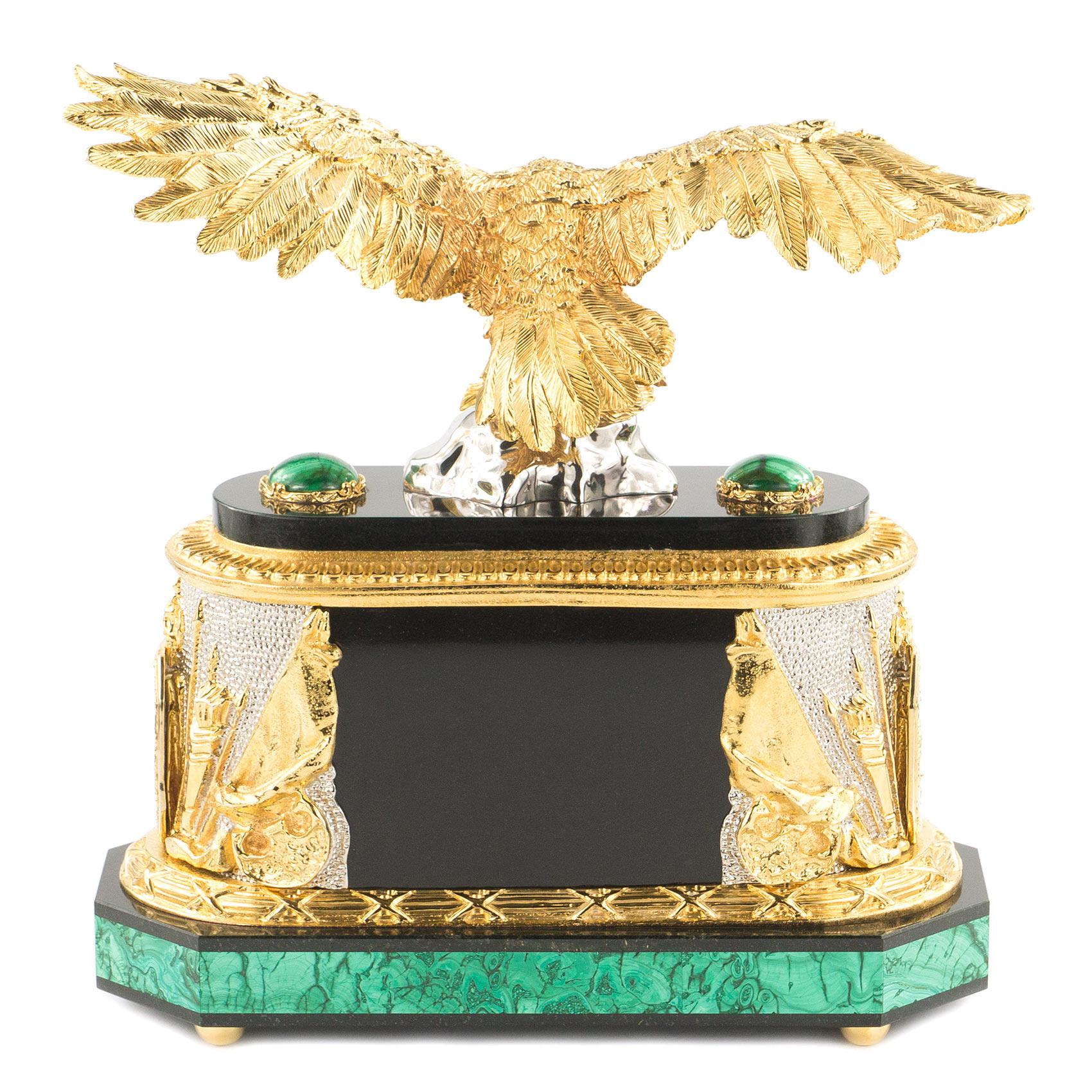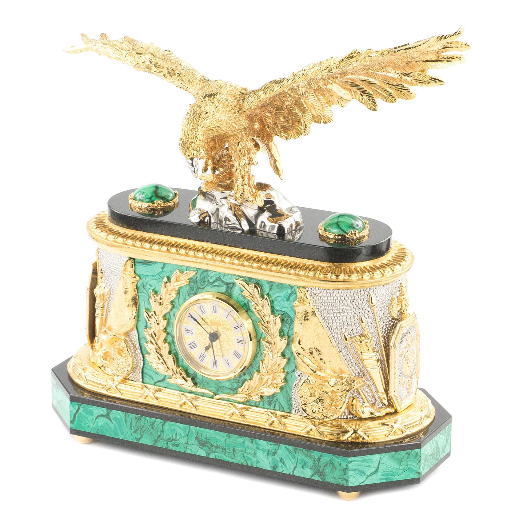 Часы орел малахит позолота 310х155х335 мм. Вес 14000 г Размер 31х15,5х33,5 см Материал малахит, долерит, латунь, никель, покрытие золотом (999,9).  развернуть описание ▼