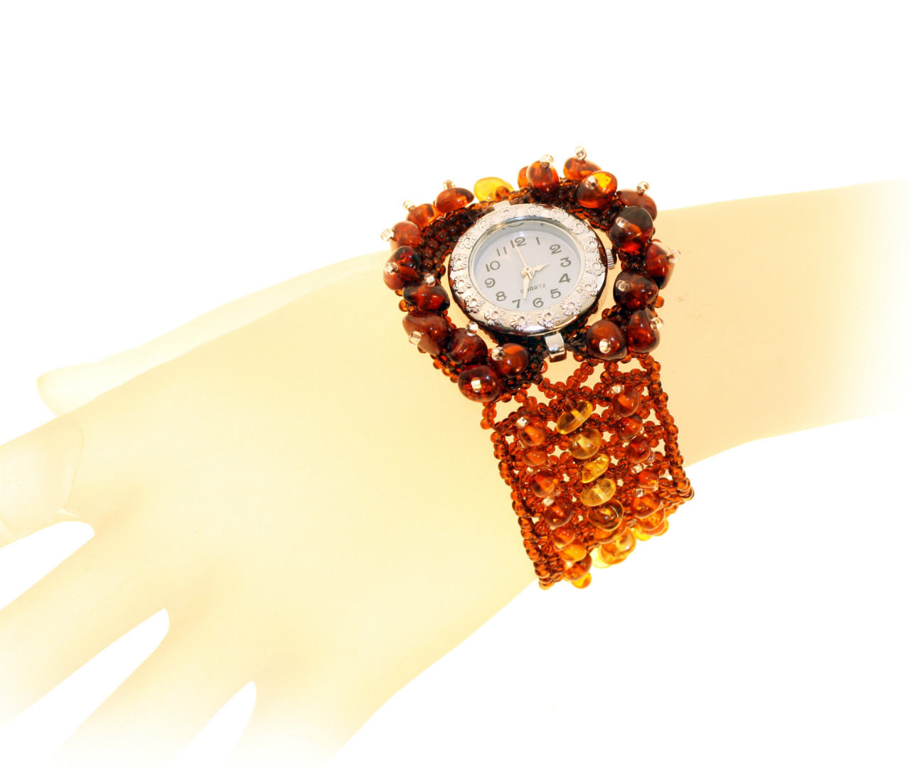 Браслет с часами из янтаря. Состав: янтарь, бисер, кварцевые часы. Длина браслета 18 см. При заказе длина может быть любой. Оттенок изделия может отличаться от оттенка на фото. При отсутствии товара на складе срок изготовления от 3-х недель. Поставляется в подарочной упаковке.