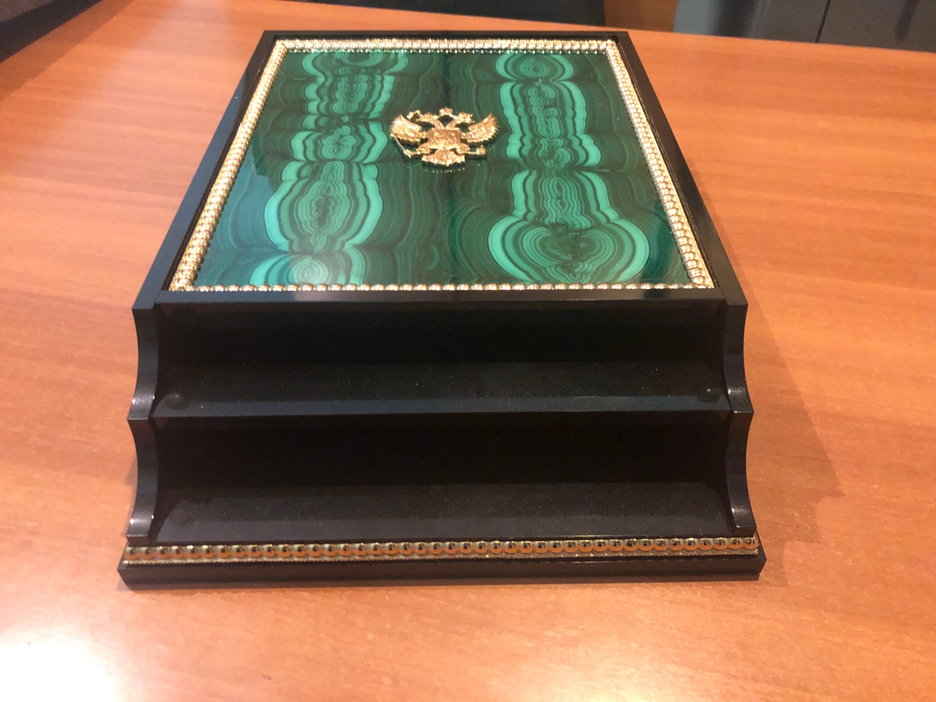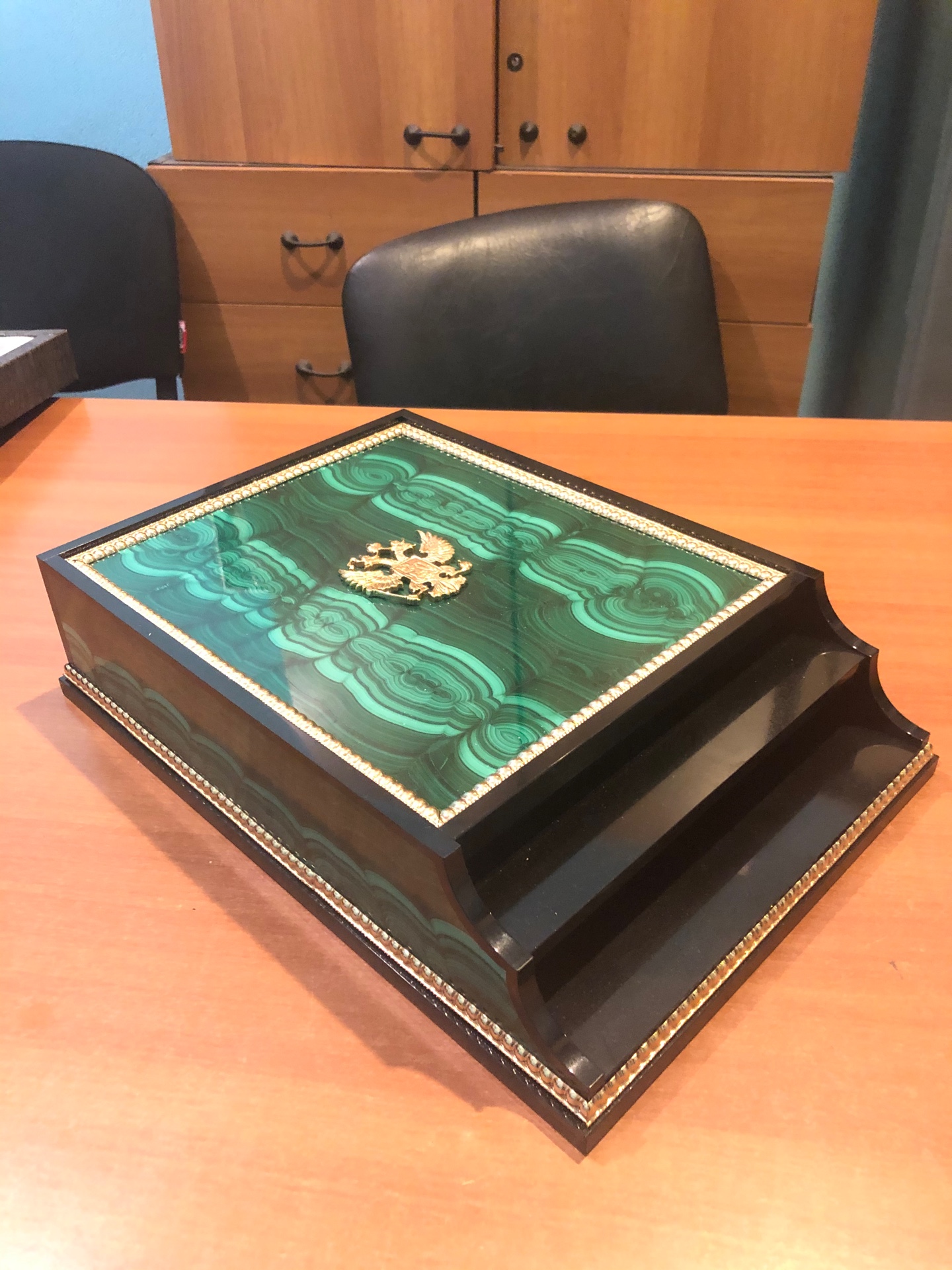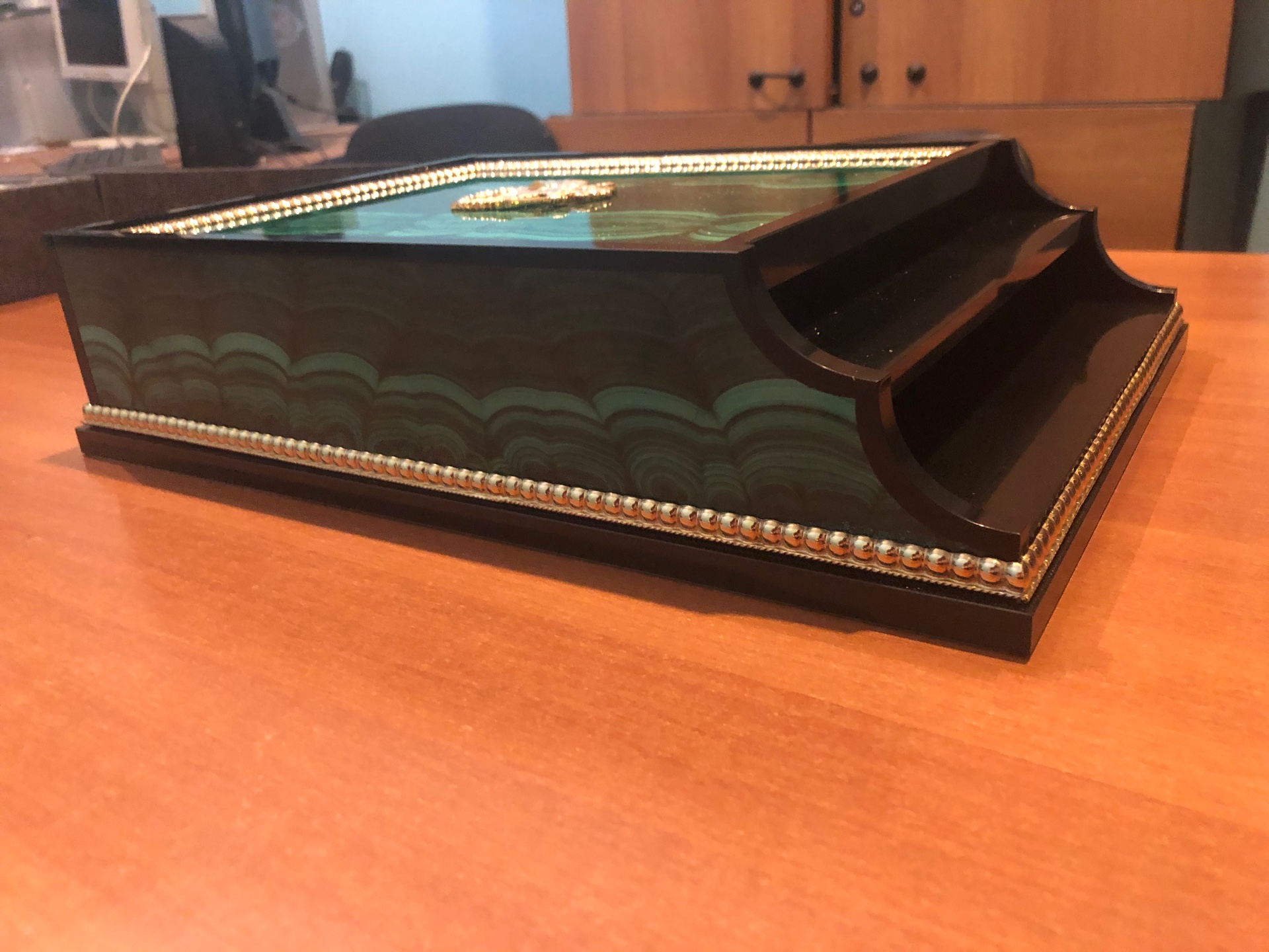Лоток для бумаг малахит 345х245х80 мм 7кг. Вес 8600 г Размер 34,5х24,5х8 см Материал малахит, долерит, бронза, никель, покрытие золотом (999,9).  развернуть описание ▼