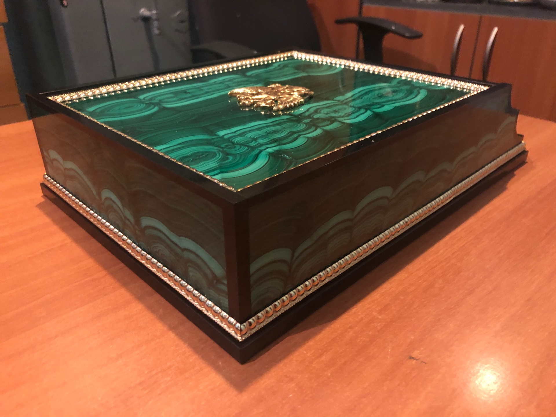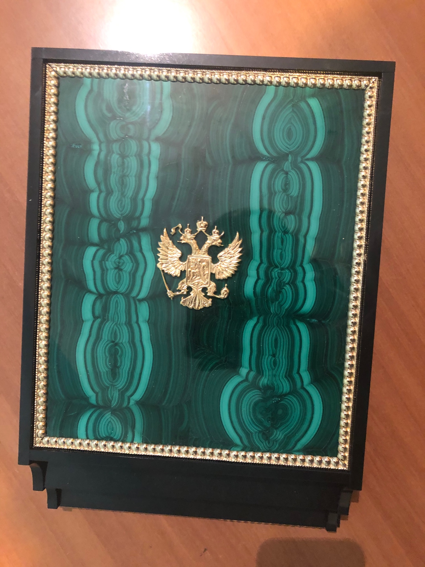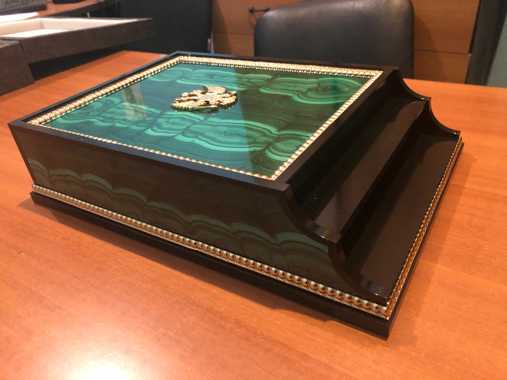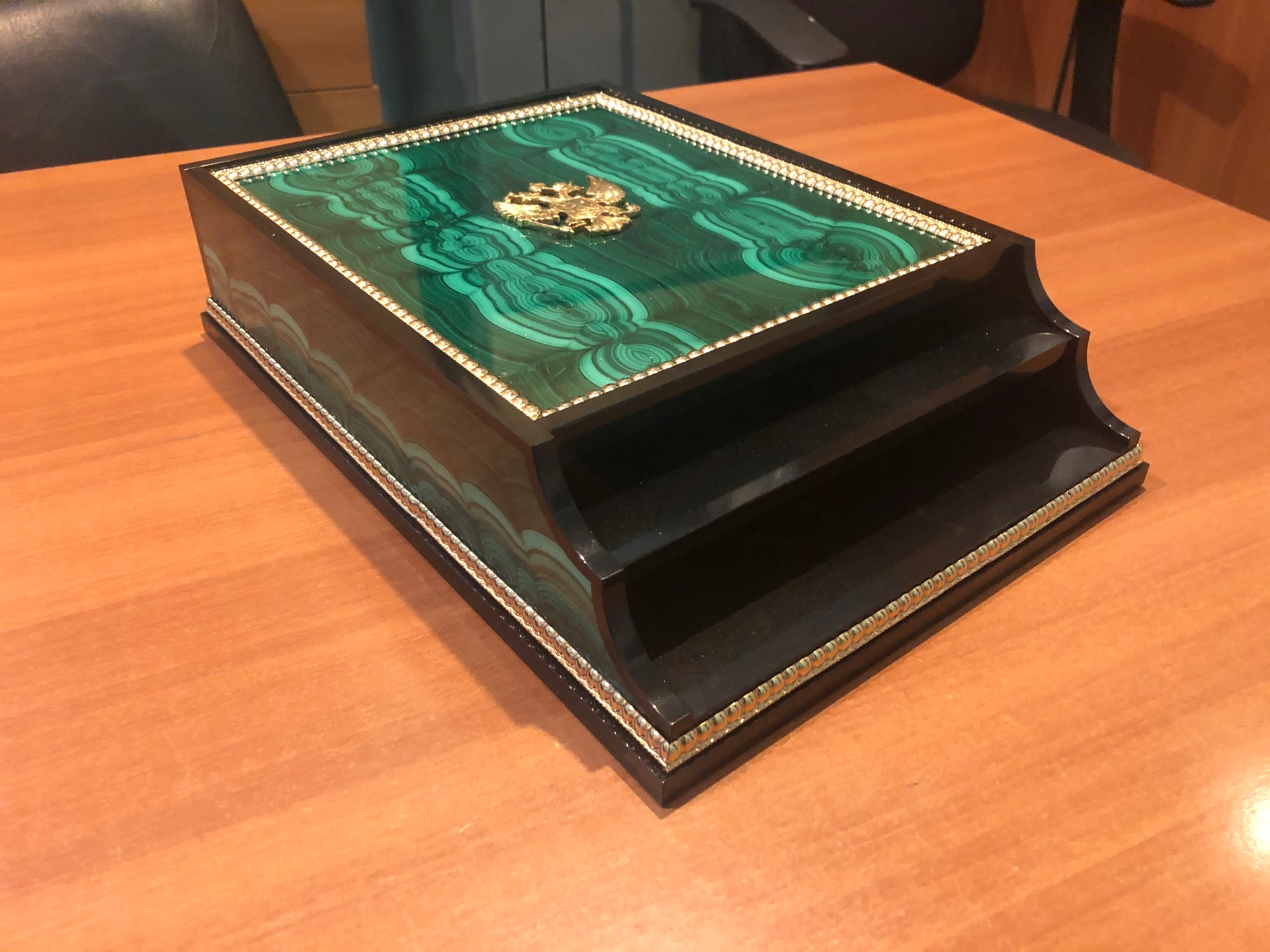 Лоток для бумаг малахит 345х245х80 мм 7кг. Вес 8600 г Размер 34,5х24,5х8 см Материал малахит, долерит, бронза, никель, покрытие золотом (999,9).  развернуть описание ▼