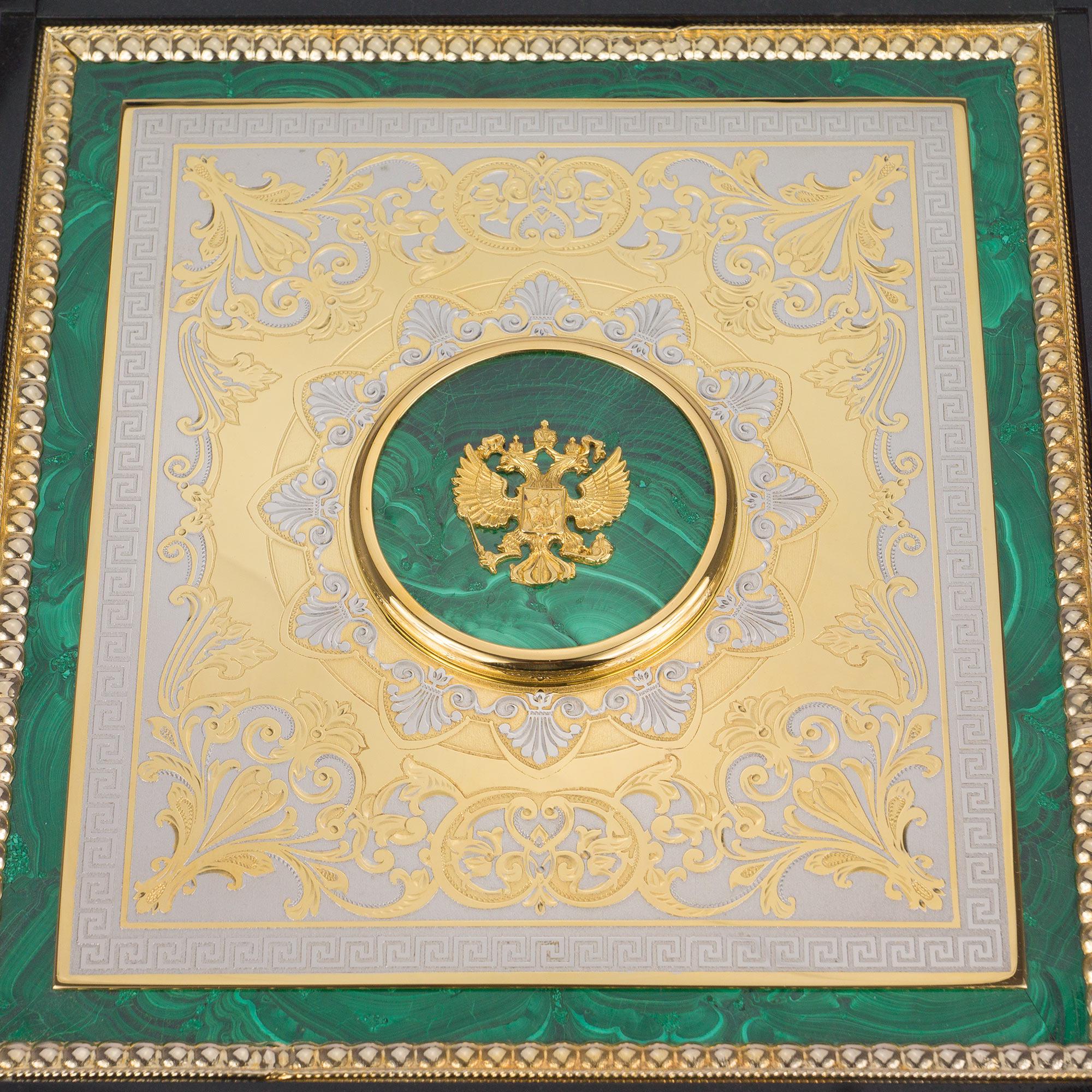 Материал: малахит, долерит, бронза, никель, покрытие золотом (999,9).