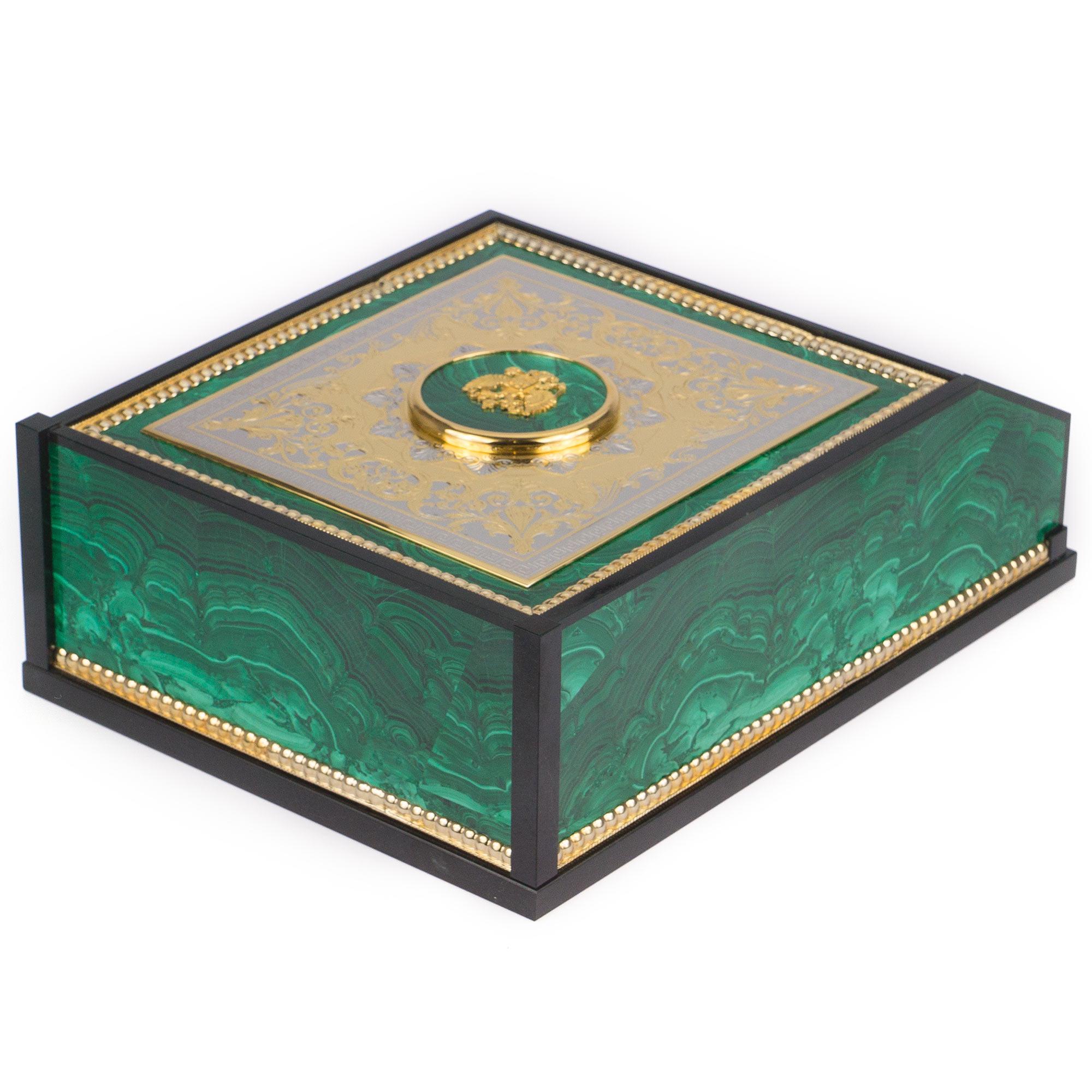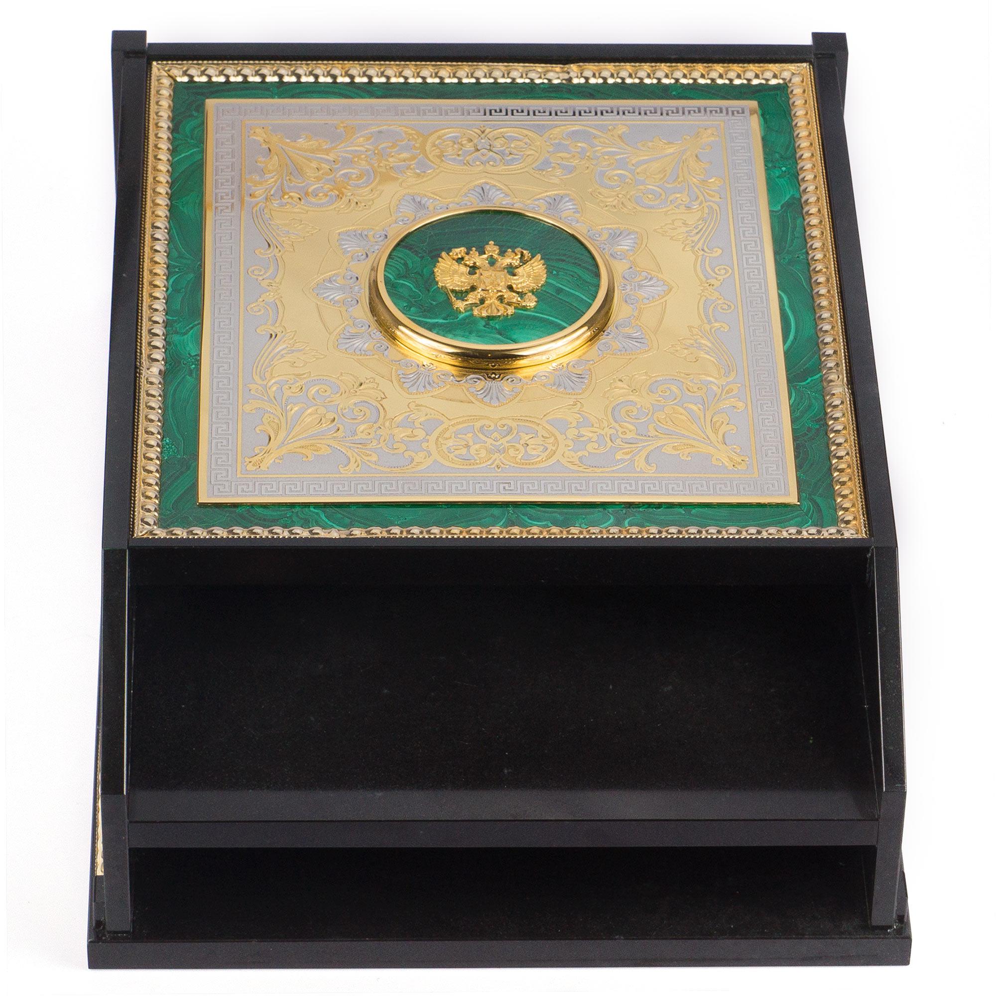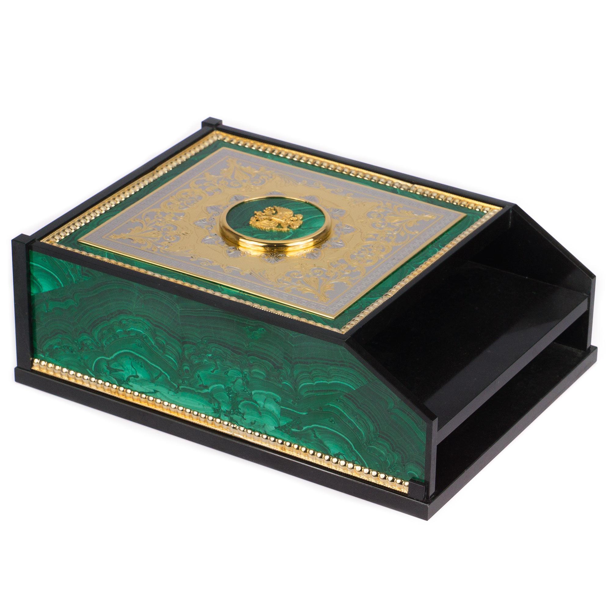 Лоток для бумаг а4 малахит позолота 315х240х110 мм. Вес 10500 г Размер 31,5х24х11 см Материал малахит, долерит, бронза, никель, покрытие золотом (999,9).  развернуть описание ▼