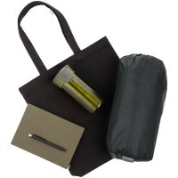Материал: термостакан - нержавеющая сталь, пластик; ежедневник - искусственная кожа, металл; ручка - металл; плед - полиэстер, плотность 210 г/м; флис, плотность 180 г/м; сумка - хлопок 100%, плотность 220 г/м
