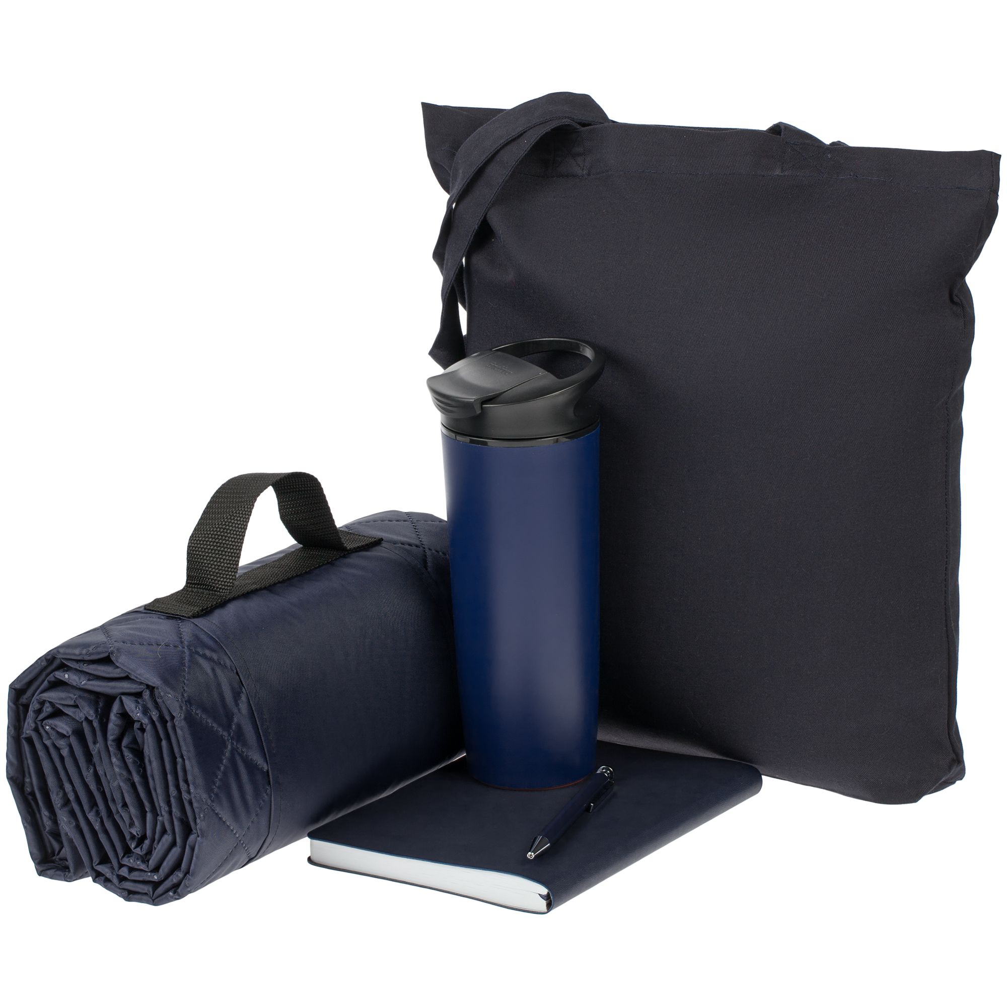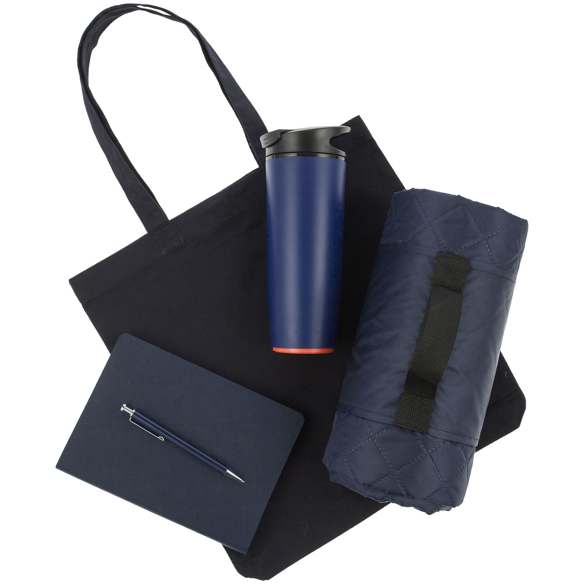 термостакан - пластик; ежедневник - искусственная кожа; ручка - алюминий; плед - полиэстер, флис, плотность 220 г/м; сумка - хлопок 100%, плотность 220 г/м