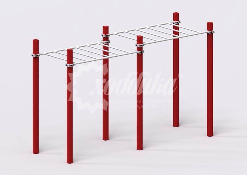 Хбво-04. Подробные характеристики Как использовать: Встать под снарядом. Взяться хватом за перекладины. Выполнять упражнения. Материалы: Опоры и перекладины: стальной цельносварной профиль различного сечения из углеродистой стали. Краска: декоративно - порошковое покрытие в печи полимеризации. Технические характеристики: Длина: 4450 мм Ширина: 1382 мм Высота: 2600 мм О модели Эргономичный и стильный тренажер предназначен для установки на спортивных площадках, парках и иных рекреационных зонах. Используется для работы над всеми группами мышц.