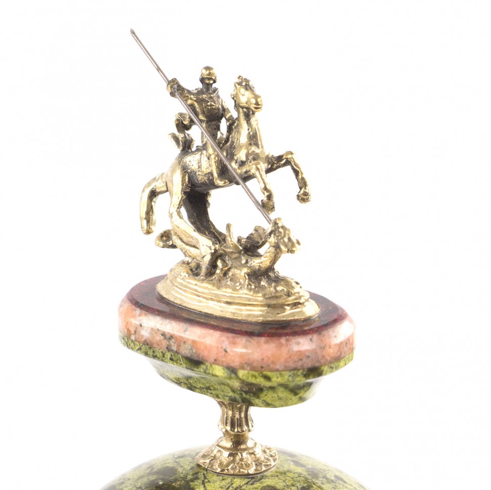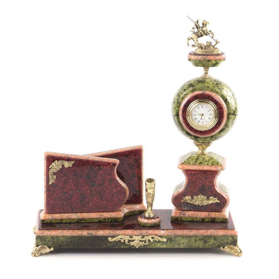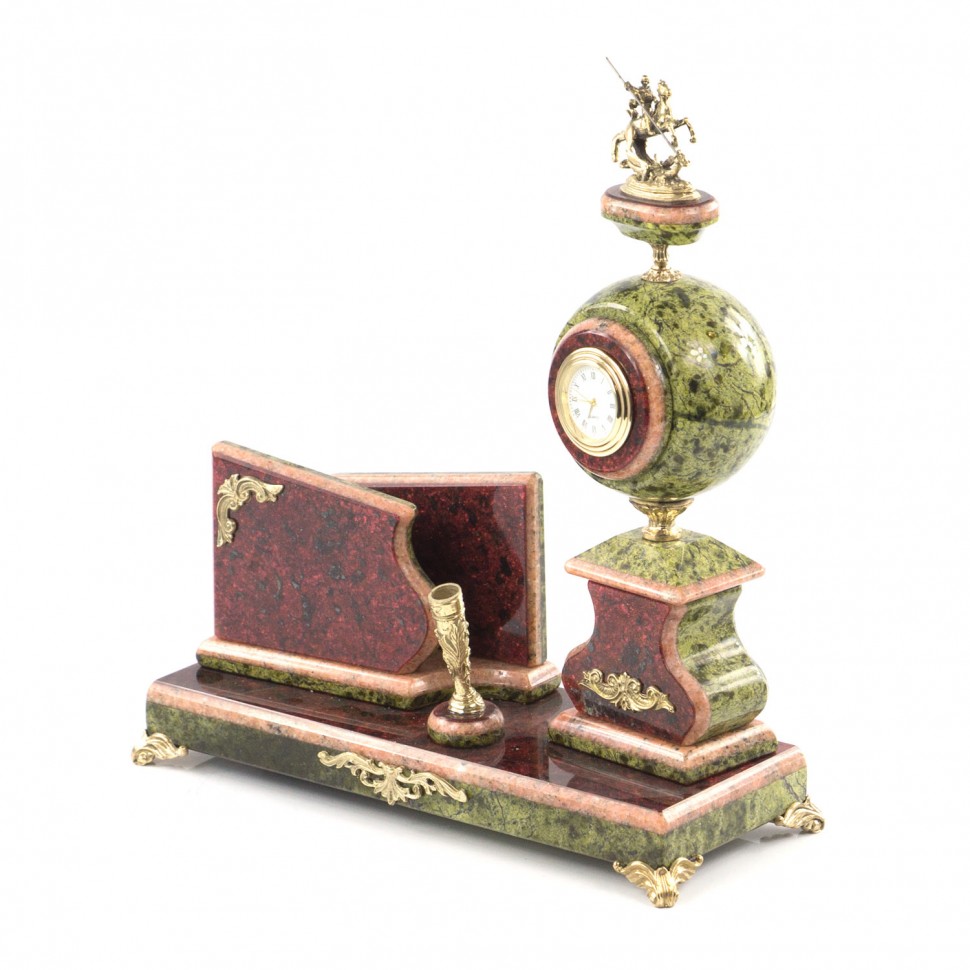 Письменный прибор "святой георгий победоносец" из змеевика и розового мрам. ХАРАКТЕРИСТИКИ Размер 26,5х10х29 см Вес 3500 г Камень Змеевик, Мрамор Месторождение Баженовское, Свердловская область, Россия Материал бронза