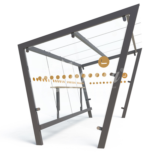 Павильон для курения «смоки». Подробные характеристики Павильон для курения оборудован удобными скамейками по всей длине павильона. Наличие специально отведенного места для курения позволяет курильщикам отдыхать в комфорте, не мешая окружающим. Материалы: Все деревянные элементы покрыты огнебиозащитной пропиткой + тонировочным составом с антисептиком. А также два слоя яхтного лака с промежуточным шлифованием. Стенки и крыша выполнены из закаленного стекла толщиной не менее 10мм. Каркас из стальных профилей различного сечения с антикоррозионным покрытием. Технические характеристики: Длина: 3900 мм Ширина: 2500 мм Высота: 2465 мм