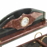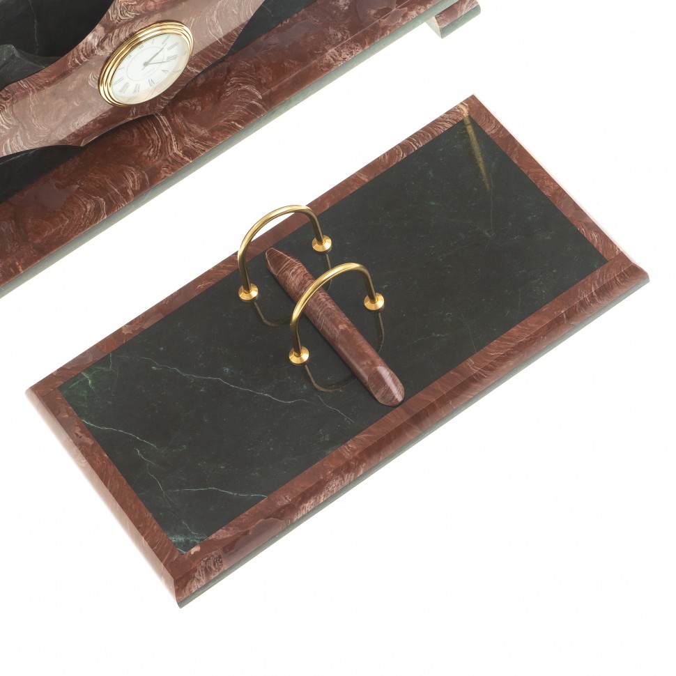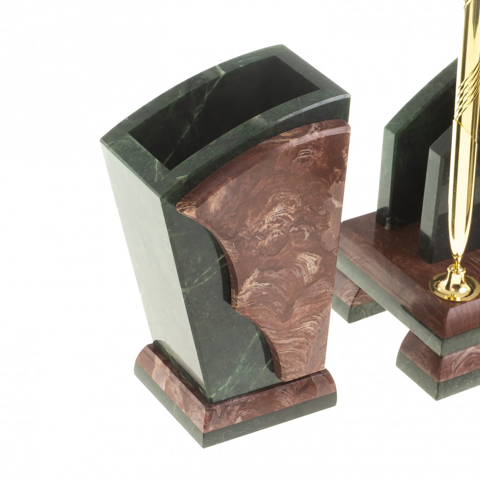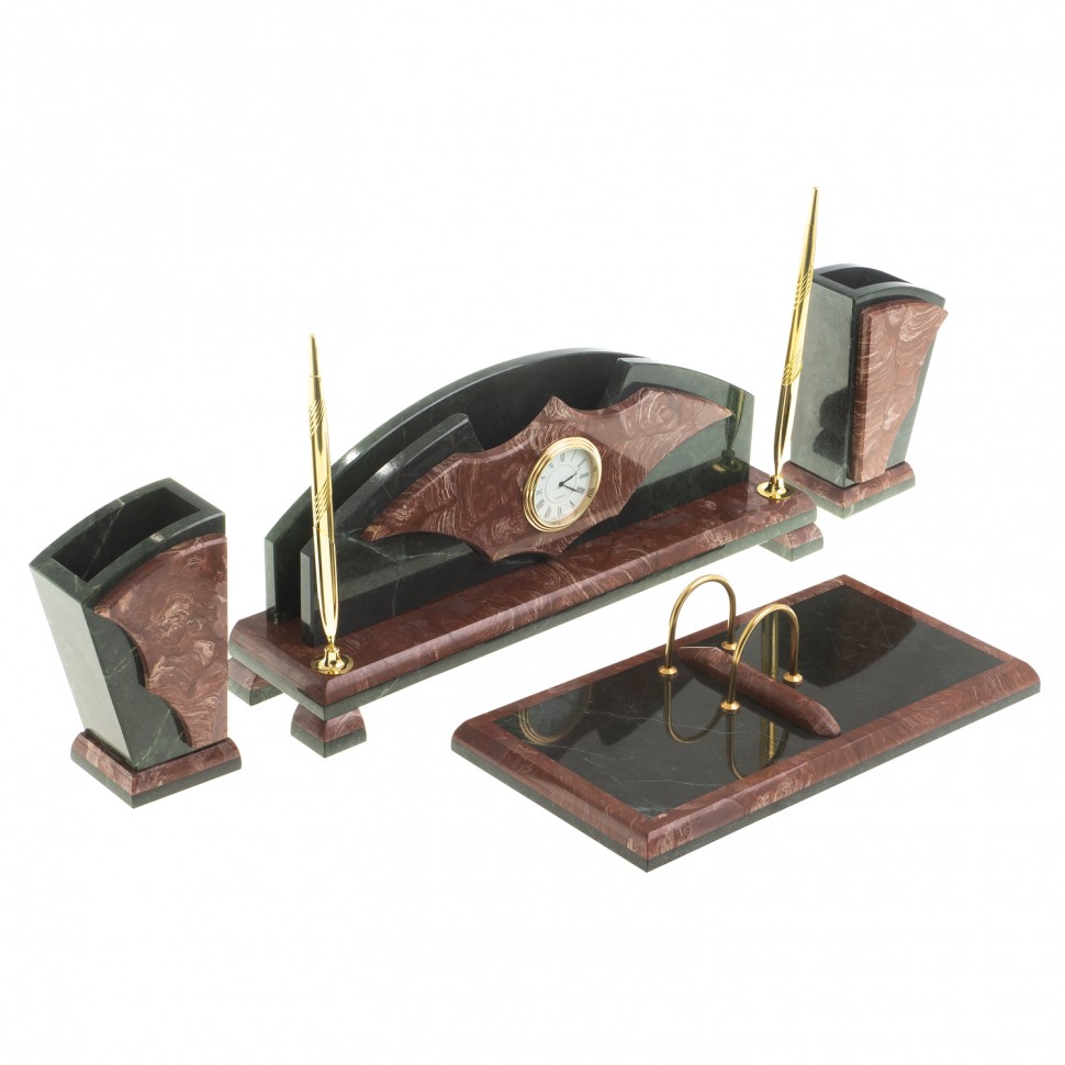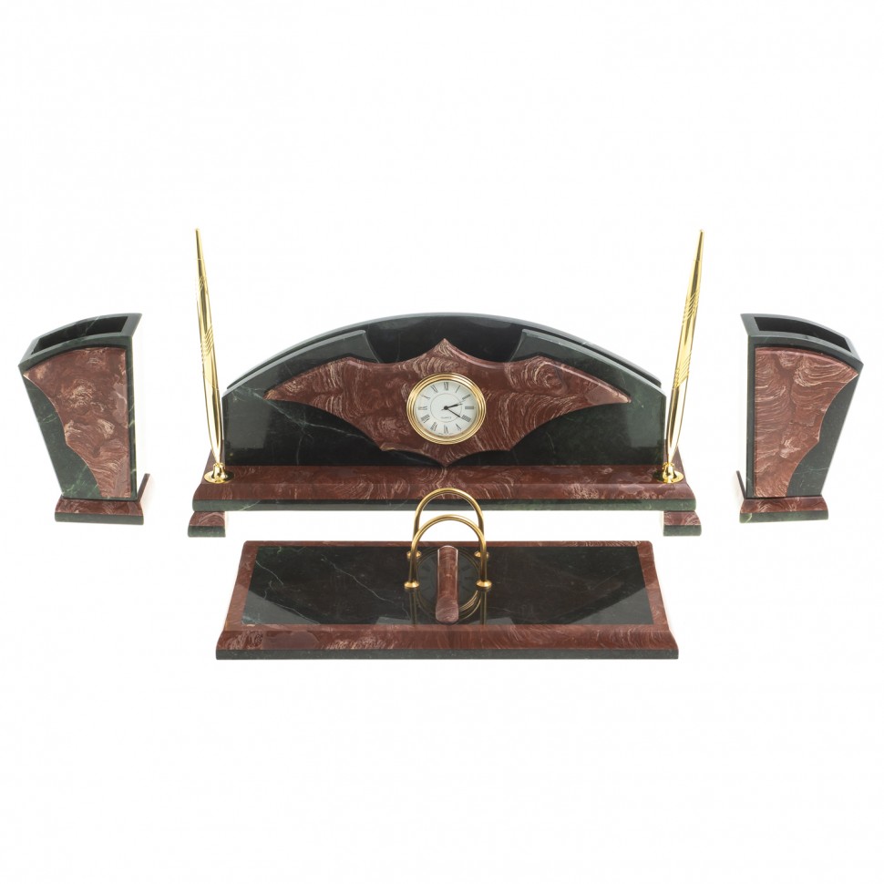 Письменный набор из натурального камня партнер. ХАРАКТЕРИСТИКИ Размер часы 36х9,5х14 см, календарница 28х14,5х2 см, карандашница 8,5х5,7х14,5 см Вес 6000 г Камень Змеевик, Лемезит Месторождение Урал, Россия Упаковка Картонная коробка ДОСТАВКА Самовывоз:бесплатнТовар изготовлен вручную из натурального камня, каждое изделие имеет индивидуальный оттенок и рисунок. Допускается наличие прожилок и внутренних трещин в камне, размеры могут немного отличаться. ОПИСАНИЕ Письменный набор из камня "Партнер" размером часы 36х9,5х14 см, календарница 28х14,5х2 см, карандашница 8,5х5,7х14,5 см и весом 6000 г.