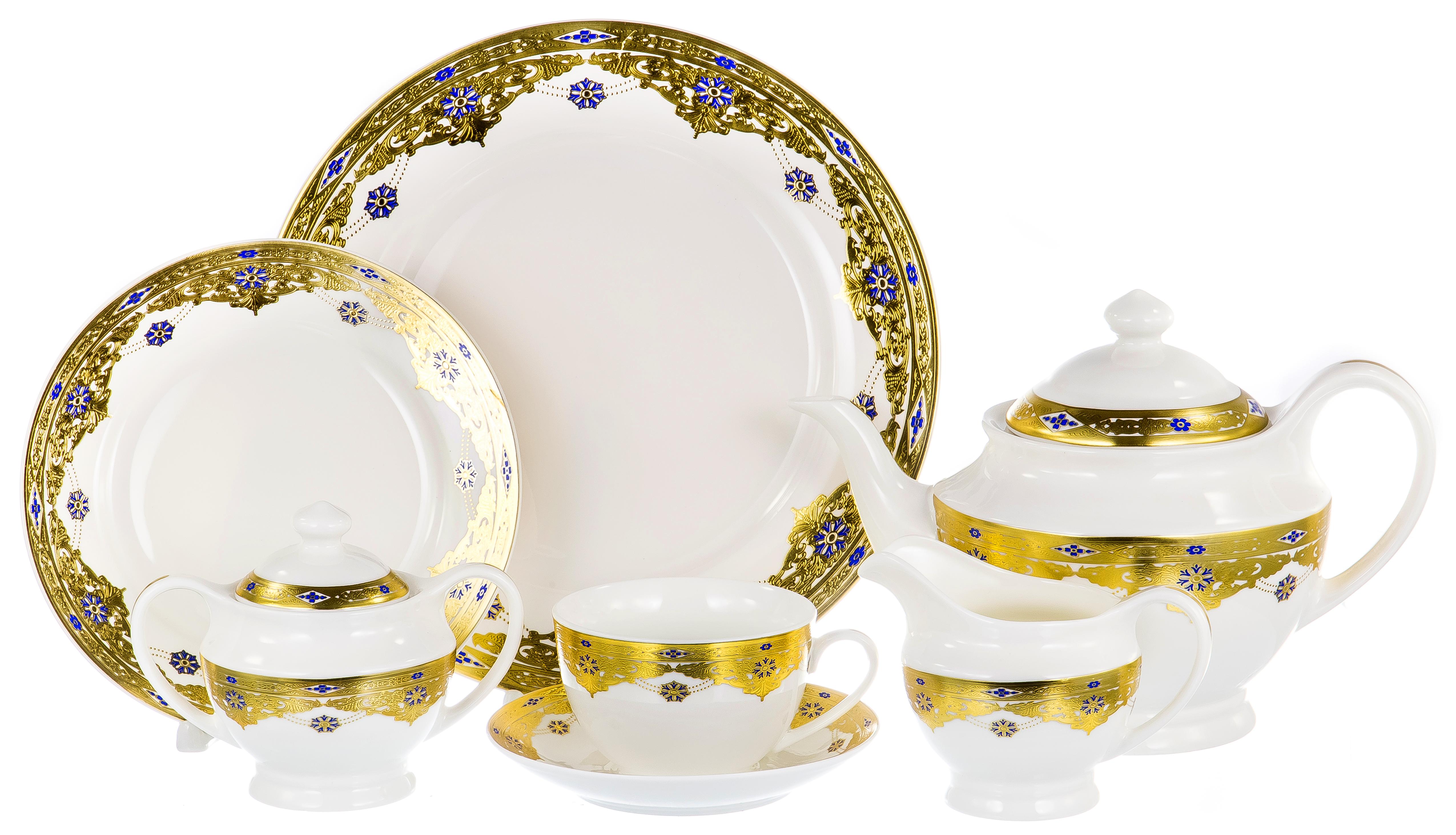 Чашка 240мл: 6 шт Блюдце 6 шт Чайник 1200мл 1 шт Сахарница 300мл 1 шт Молочник 350мл 1 шт Блюдо 27см 1 шт Десертная тарелка 19см 6 шт