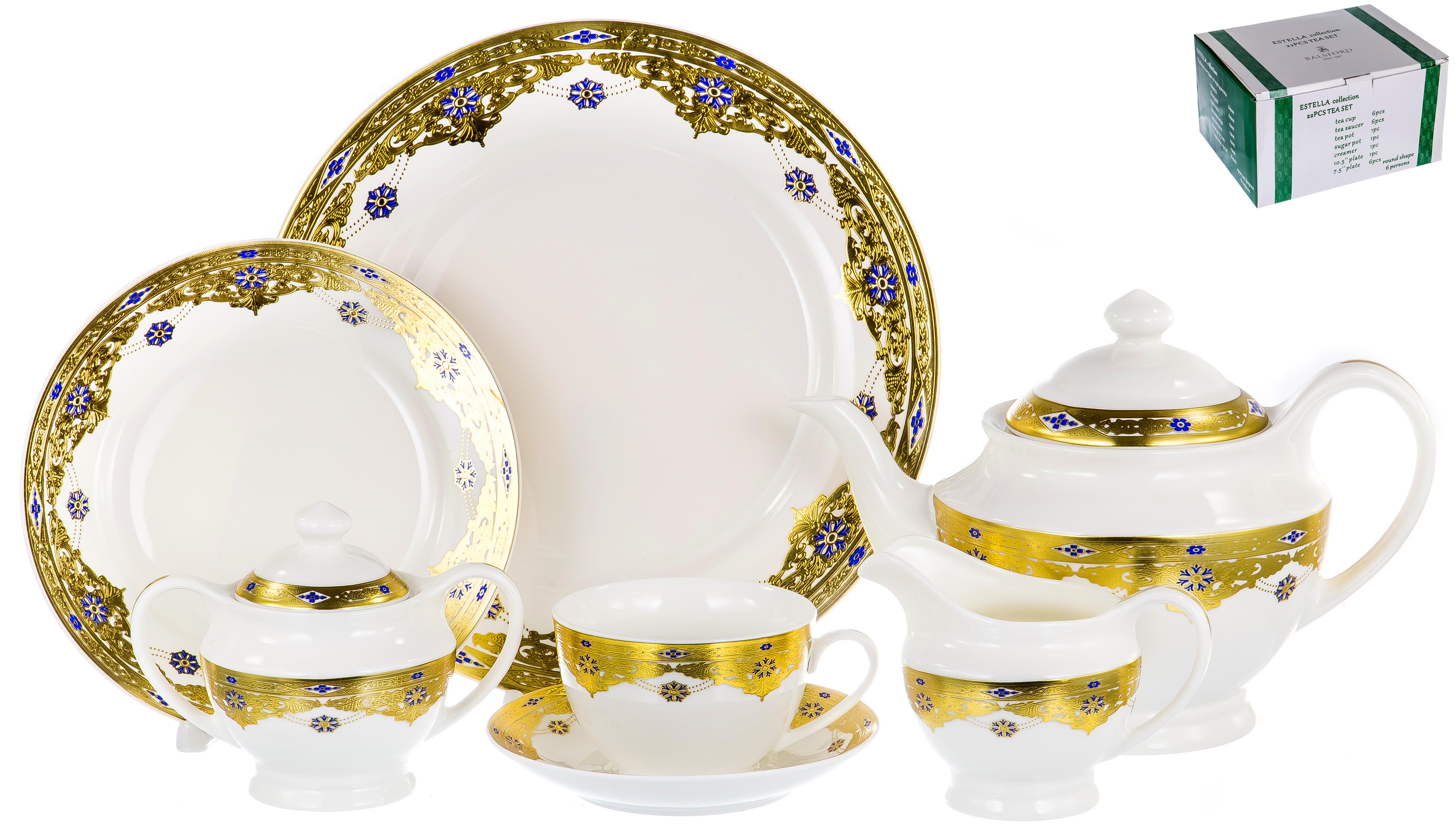 Набор столовый эстелла «дворцовые тайны», 22 предмета. Чашка 240мл 6 шт Блюдце 6 шт Чайник 1200мл 1 шт Сахарница 300мл 1 шт Молочник 350мл 1 шт Блюдо 27см 1 шт Десертная тарелка 19см 6 шт Производитель Balsford Общие Материал New bone china Линия Дворцовые тайны Штрих 4680411422576 Серия Эстелла Упаковка Тип упаковки подарочная упаковка Объём упаковки, м3 0,07 Подарочная упаковка да Информация о наборе Набор да В наборе, шт 22 Количество персон 6 Экспортная коробка Фасовка, уп 2 Вес коробки, кг 12 Эстелла, набор столовый (22) 6 чашек 240мл + 6 блюдец + чайник 1200мл + сахарница 300мл + молочник 350мл + блюдо 27см + 6 десертных тарелок 19см, new bone china, цветной дизайн с золотом, подарочная упаковка