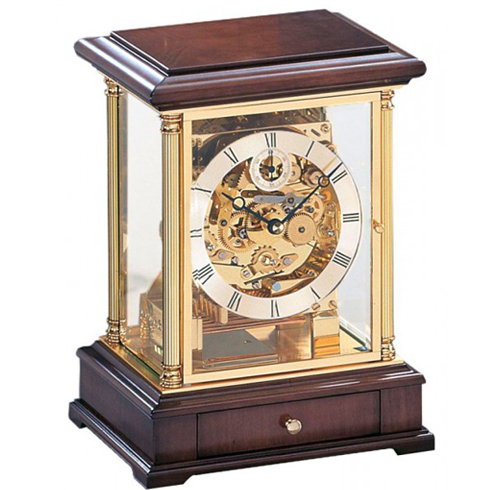 Настольные механические часы kieninger elegant 1258-23-01. Настольные механические часы Kieninger Elegant 1258-23-01 с боем Механические настольные часы Kieninger Elegant 1258-23-01 c боем имеют надежный механизм. Часы -скелетон c открытым циферблатом в полированном латунном корпусе, со стеклянными вставками с фронтальной, задней и боковых сторон на деревянном основании. Имеют небольшой ящичек для ключей в основании корпуса. Белый циферблат с римскими цифрами, стрелки в стиле Breguet. Запас хода- 8 дней. Фронтальный завод. Характеристики Kieninger Elegant 1258-23-01 Бой каждый час. 3 мелодии Westminster, St.Michael's, Whittington каждые четверть часа. 8-стержневой гонг. Механизм: механический спусковой (11 камней), калибр J0212. Автоматическое отключение боя c 22.00 до 7.15 ч. (патент Kieninger). Размер, см : 20x26,5x16 Цвет : Орех Материал : Дерево Механизм : Механический Функции : Мелодия, Бой, Ночной режим СКИДКИ : Индивидуальные