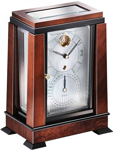 Часы настольные kieninger 1272-23-01. Деревянные настольные часы Kieninger 1272-23-01 Настольные часы механические, изящные каминные часы в стиле арт-деко; корпус из ореха с отделкой из корневища грецкого ореха, минеральные стекла с фасками на боковых и верхней части корпуса, 2 двери с минеральным стеклом, циферблат с датой, открытый анкерный механизм, Сквозь прозрачное окошко на циферблате можно наблюдать за работой механизма часов. Тип механизма механический, калибр NE004 Корпус дерево, шпон, стекло Циферблат серебристый, арабские цифры Календарь число
