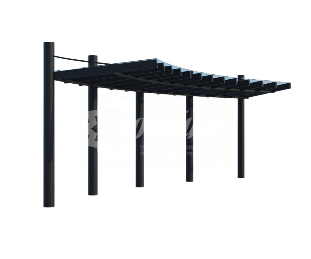 Навес тип 5. Подробные характеристики Материалы: Опоры и каркас: Стальной профиль различного сечения. Защита от коррозии. Покрыты порошковой полимерной краской. Возможность выбора цвета по каталогу RAL. Стандартный цвет (по умолчанию) - серый. Брус - ангарская сосна/лиственница (вариант исполнения: композитные материалы) различного сечения. Огнебиозащитные пропитки + тонировочный состав с антисептиком + два слоя яхтного лака с промежуточным шлифованием. Возможность выбора цвета из палитры. Фурнитура: Оцинкованная. Возможность выбора цвета фурнитуры по каталогу RAL. Стандартный цвет (по умолчанию) - серебристый. Возможность использования потайной/скрытой фурнитуры. Технические характеристики: Высота: 3400 мм Ширина: 2500 мм Длина: 40000 мм