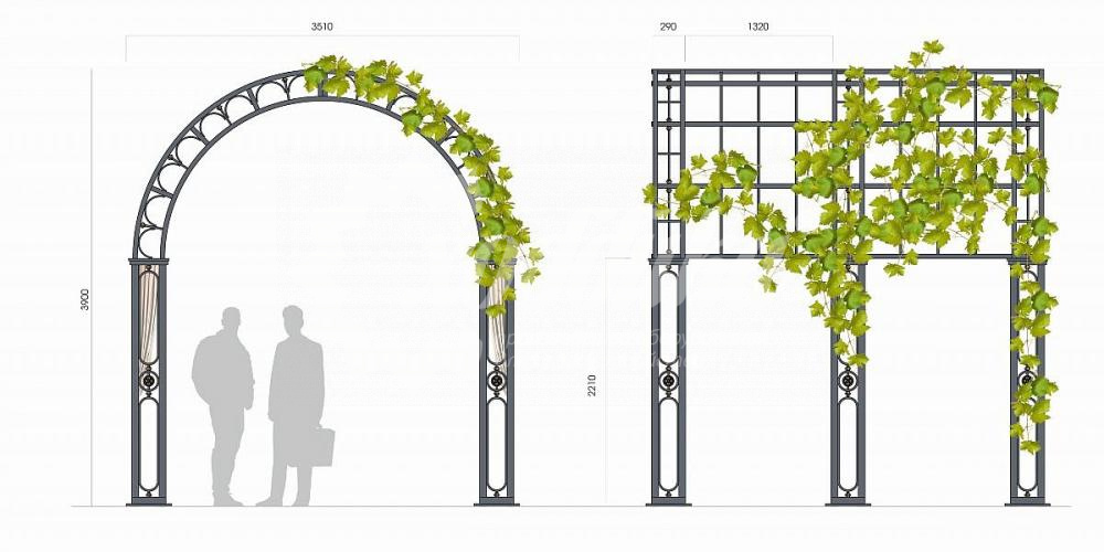 Пергола тип 1. Подробные характеристики Материалы: Опоры и каркас: Стальной профиль различного сечения. Защита от коррозии. Покрыты порошковой полимерной краской. Возможность выбора цвета по каталогу RAL. Стандартный цвет (по умолчанию) - серый. Фурнитура: Оцинкованная. Возможность выбора цвета фурнитуры по каталогу RAL. Стандартный цвет (по умолчанию) - серебристый. Возможность использования потайной/скрытой фурнитуры. Технические характеристики: Высота: 3900 мм Ширина: 3510 мм Длина: 3510 мм