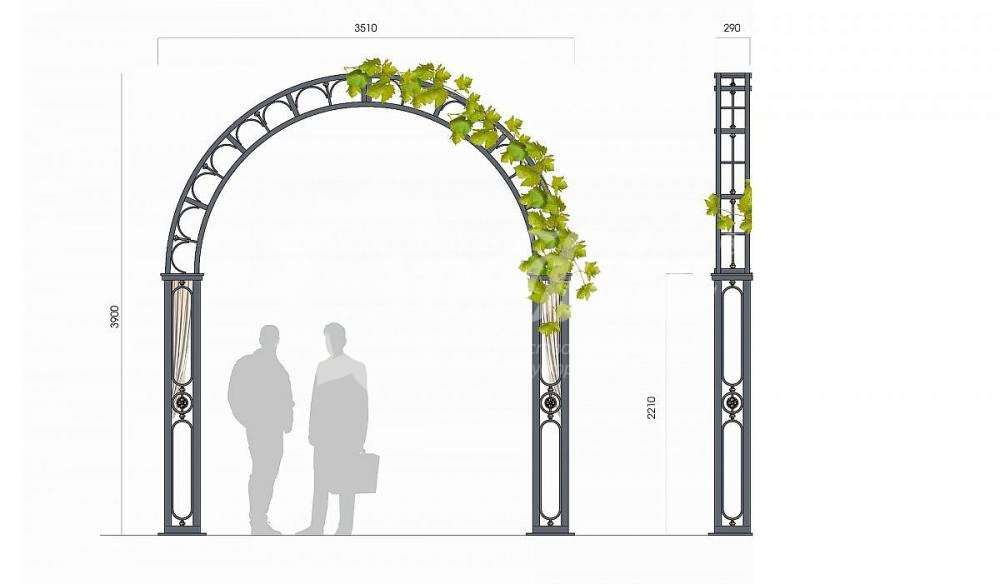 Пергола тип 2. Подробные характеристики Материалы: Опоры и каркас: Стальной профиль различного сечения. Защита от коррозии. Покрыты порошковой полимерной краской. Возможность выбора цвета по каталогу RAL. Стандартный цвет (по умолчанию) - серый. Фурнитура: Оцинкованная. Возможность выбора цвета фурнитуры по каталогу RAL. Стандартный цвет (по умолчанию) - серебристый. Возможность использования потайной/скрытой фурнитуры. Технические характеристики: Высота: 3900 мм Ширина: 290 мм Длина: 3510 мм