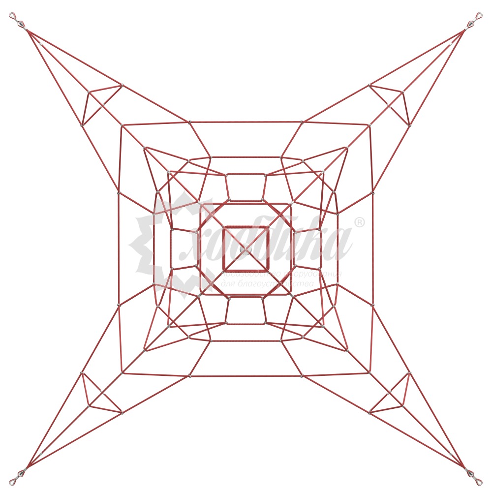 Канатная конструкция кн-00861-09 «снежинка». Подробные характеристики Материалы: Изготовлена из армированного каната и соединителей, выполненных из алюминия. Характеристики: Длина: 6990 мм Ширина: 6990 мм Высота: 3900 мм О модели Данная канатная конструкция может использоваться как в помещении, так и на открытых площадках.